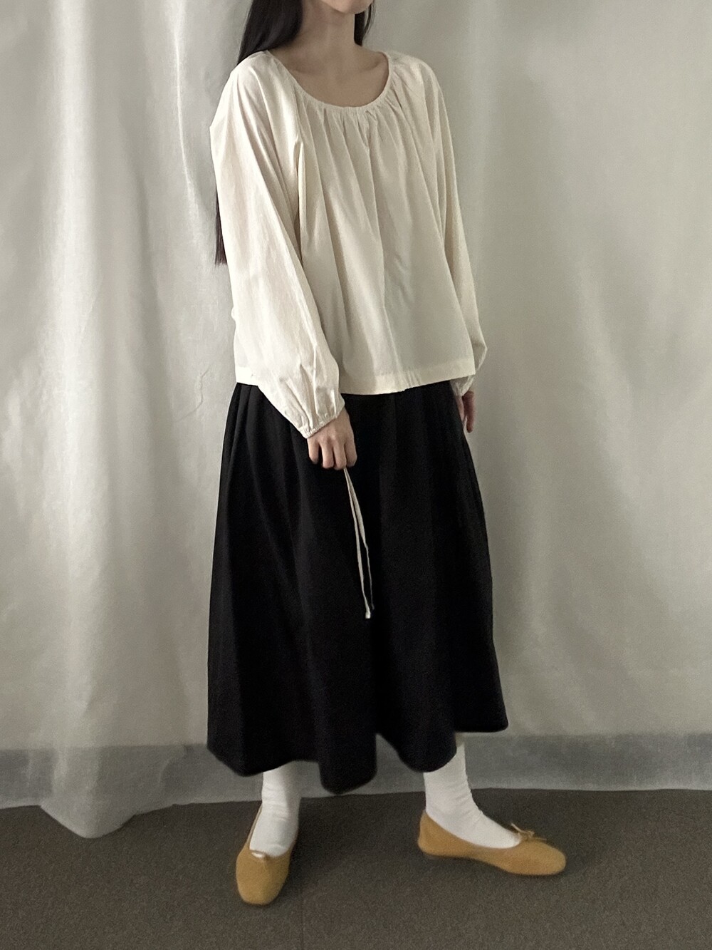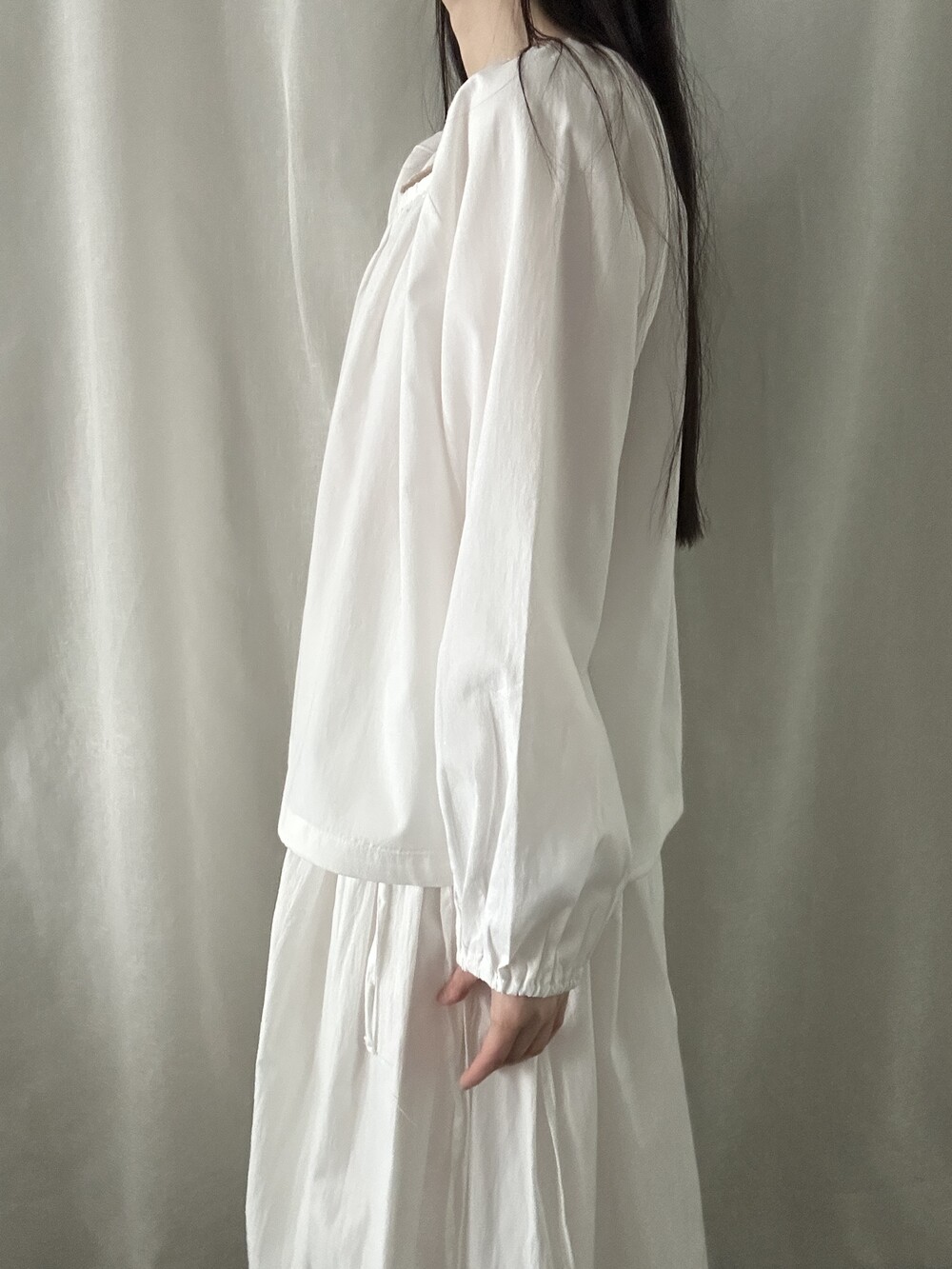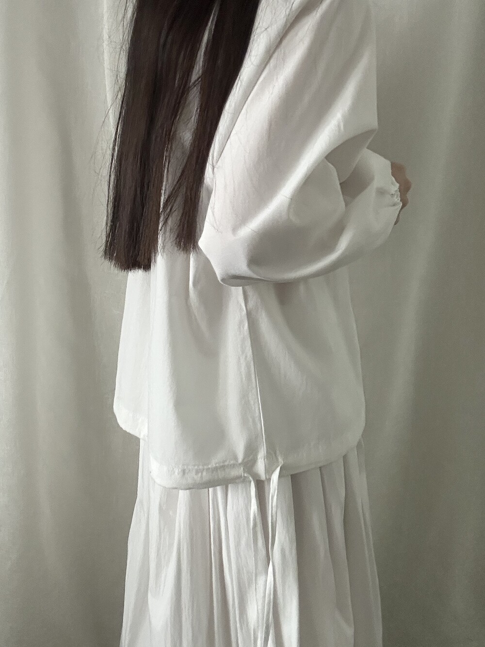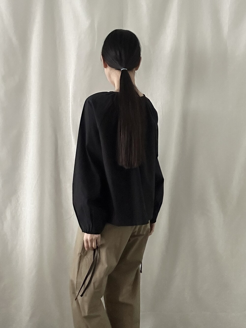 소매 끝단은 밴딩으로 처리해 소매를 걷어 올리고 내리기 편안함은 물론 자연스럽게 잡힌 셔링은 넥라인 셔링과 조화롭게 이루어져 페미닌한 무드를 극대화 해줍니다.