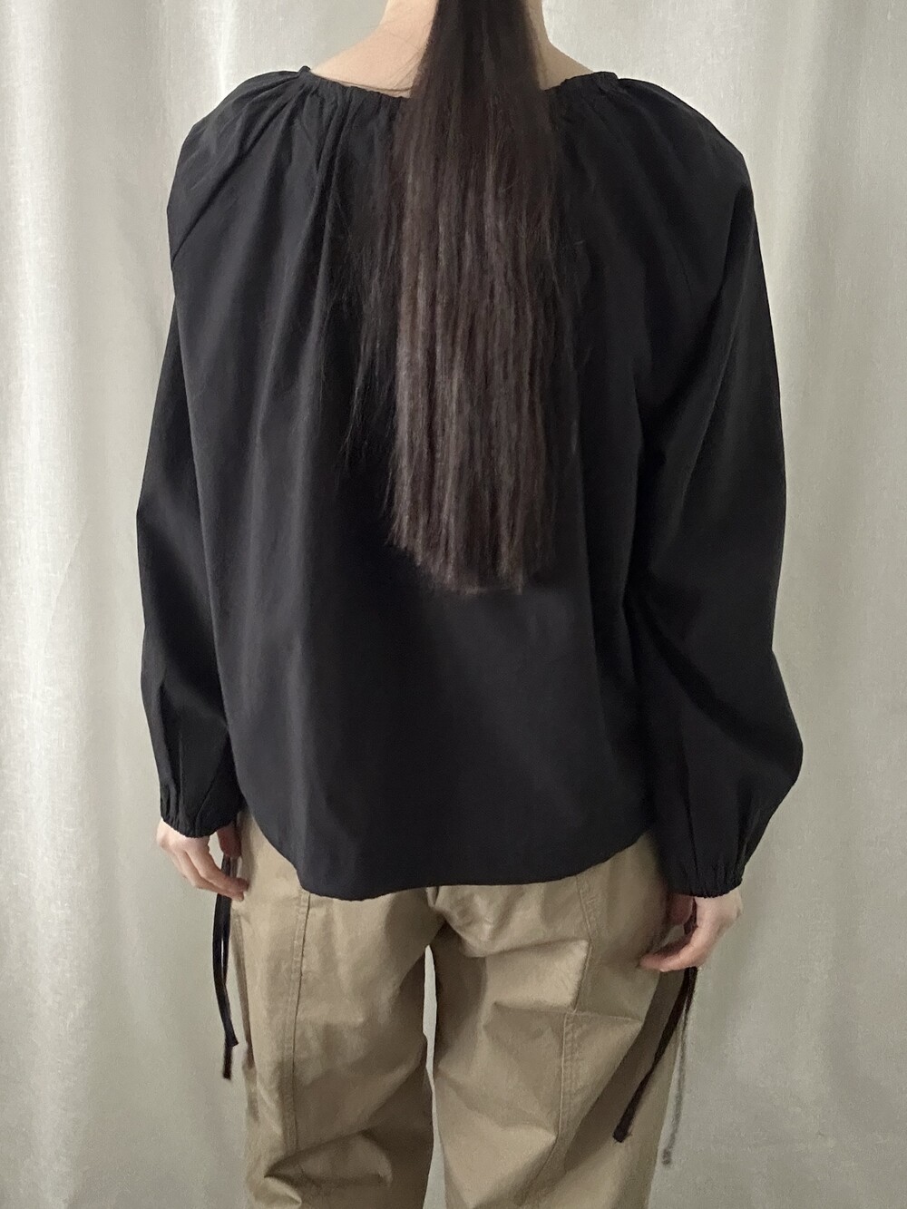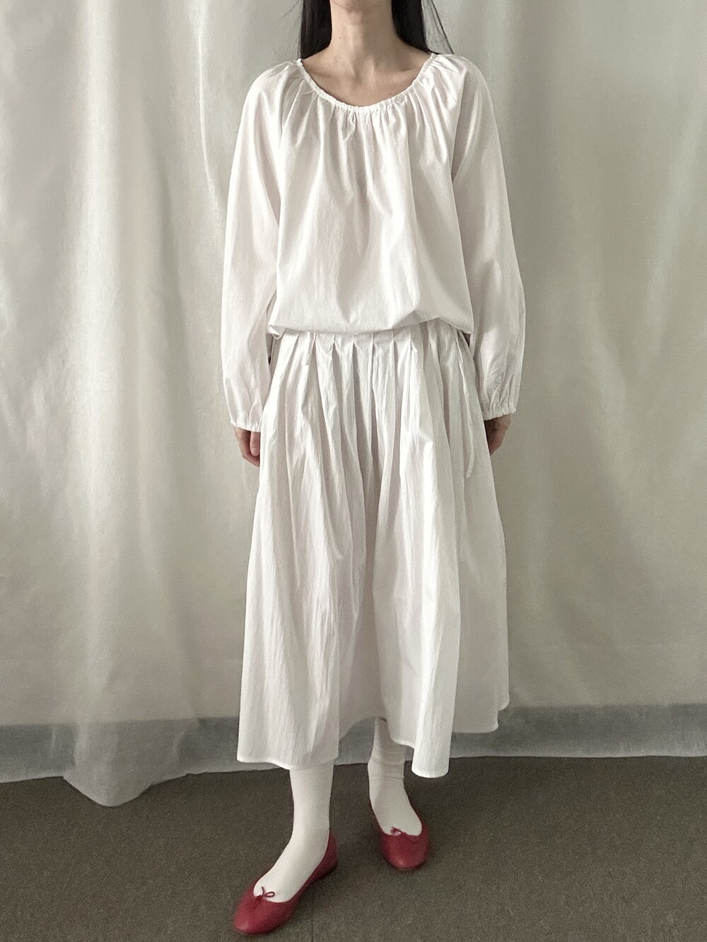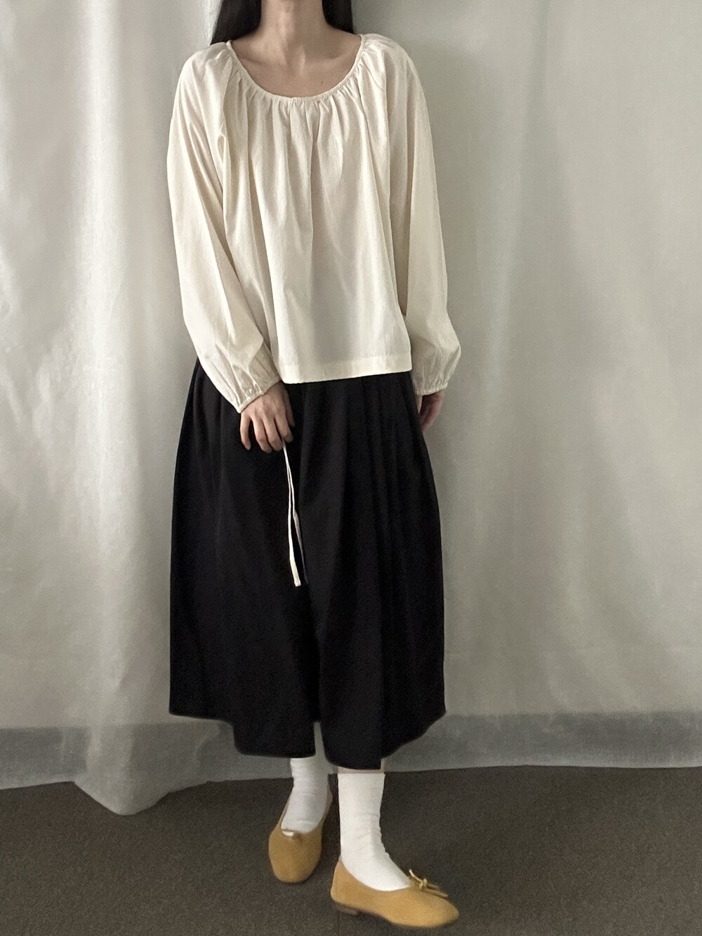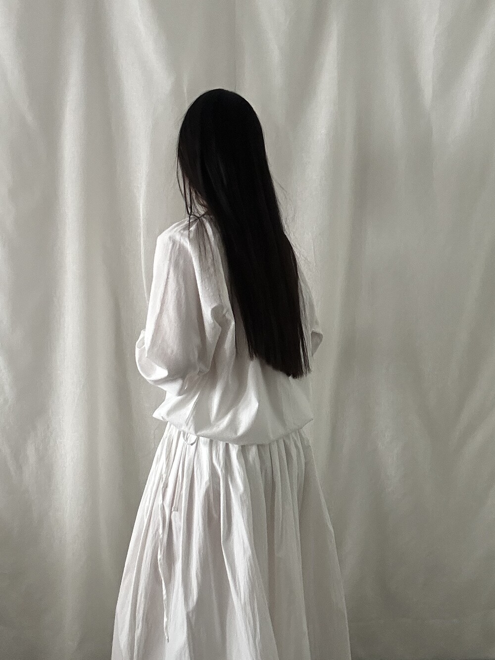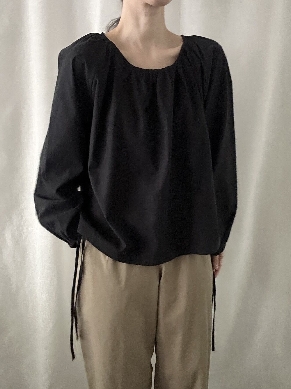 소매 끝단은 밴딩으로 처리해 소매를 걷어 올리고 내리기 편안함은 물론 자연스럽게 잡힌 셔링은 넥라인 셔링과 조화롭게 이루어져 페미닌한 무드를 극대화 해줍니다.