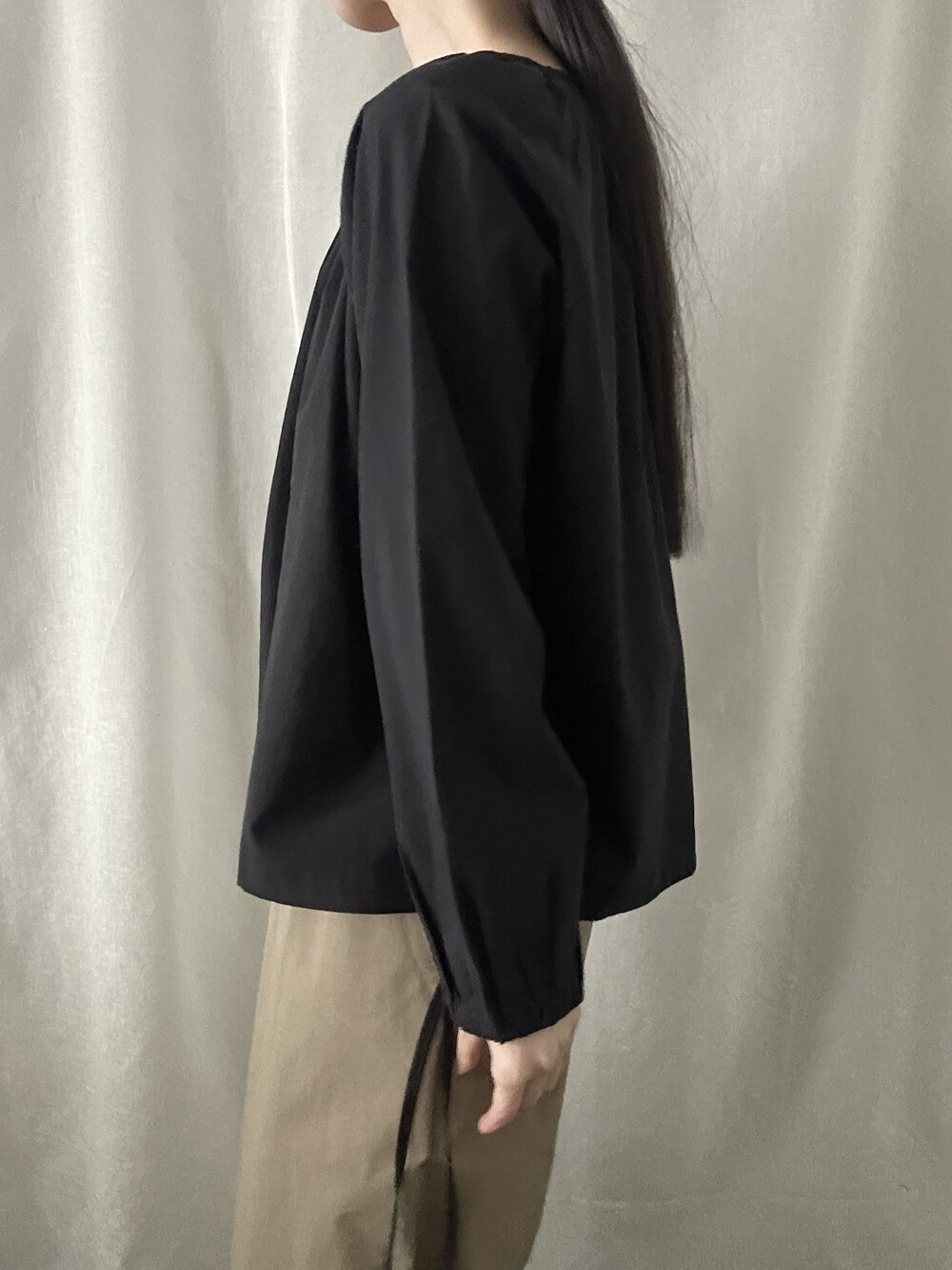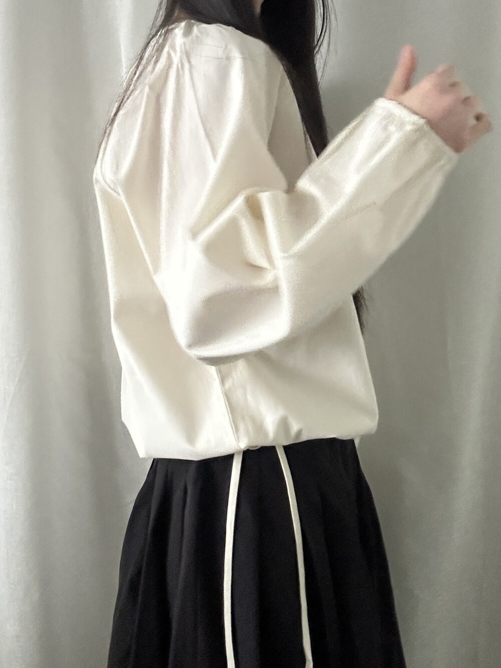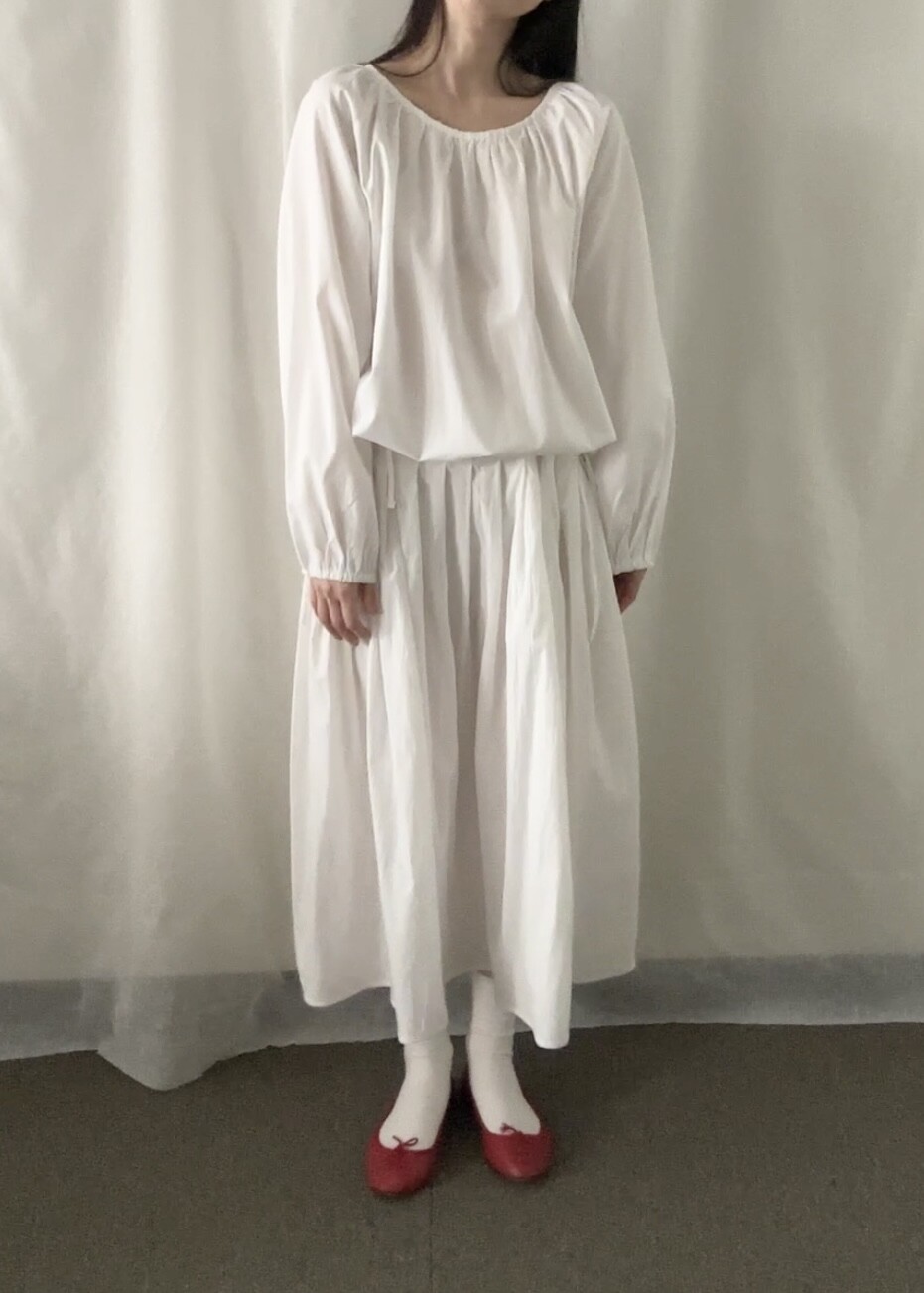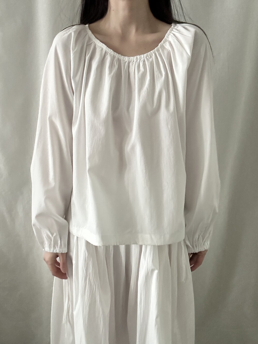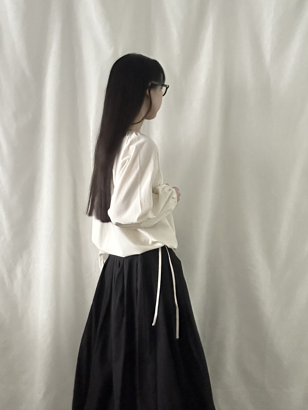 소매 끝단은 밴딩으로 처리해 소매를 걷어 올리고 내리기 편안함은 물론 자연스럽게 잡힌 셔링은 넥라인 셔링과 조화롭게 이루어져 페미닌한 무드를 극대화 해줍니다.
