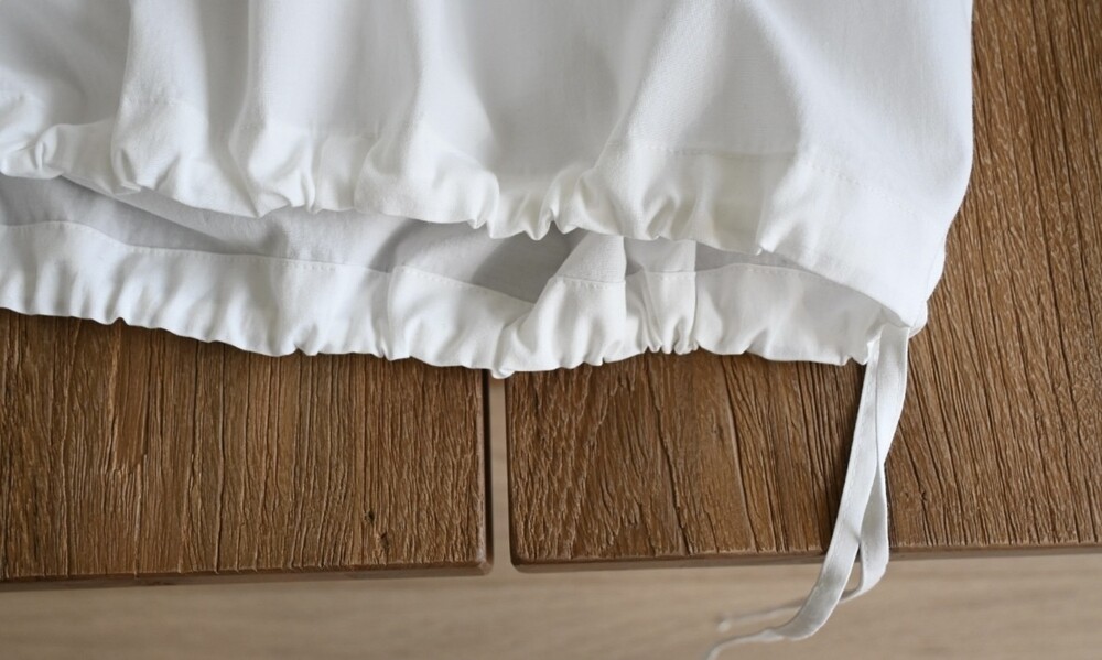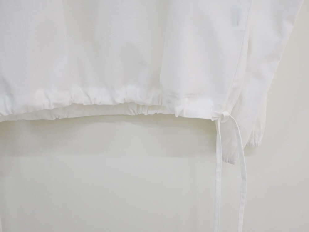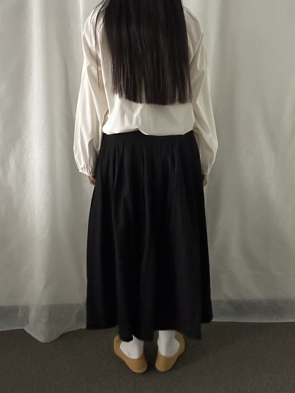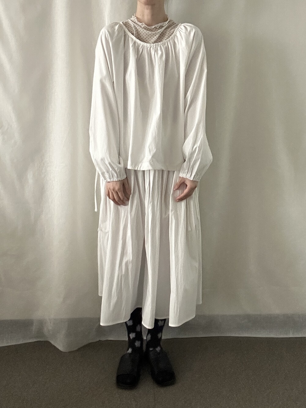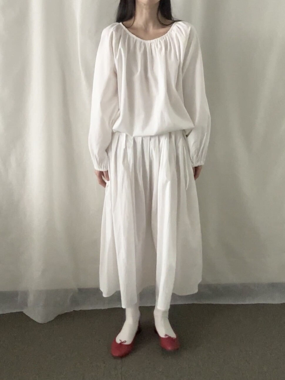 소매 끝단은 밴딩으로 처리해 소매를 걷어 올리고 내리기 편안함은 물론 자연스럽게 잡힌 셔링은 넥라인 셔링과 조화롭게 이루어져 페미닌한 무드를 극대화 해줍니다.
