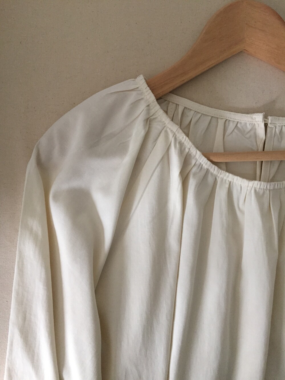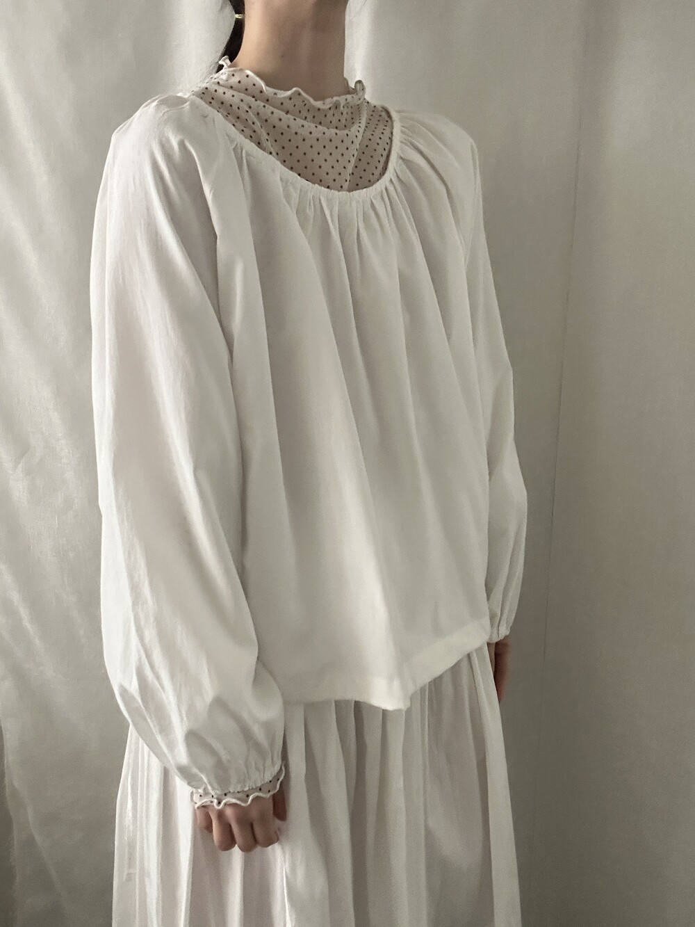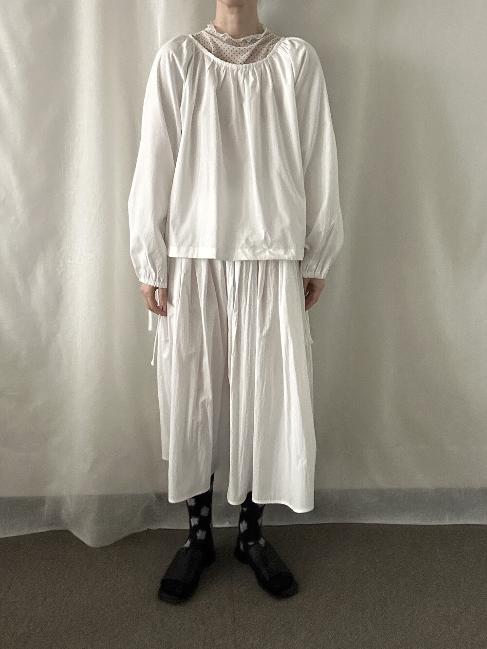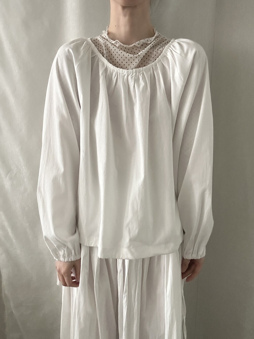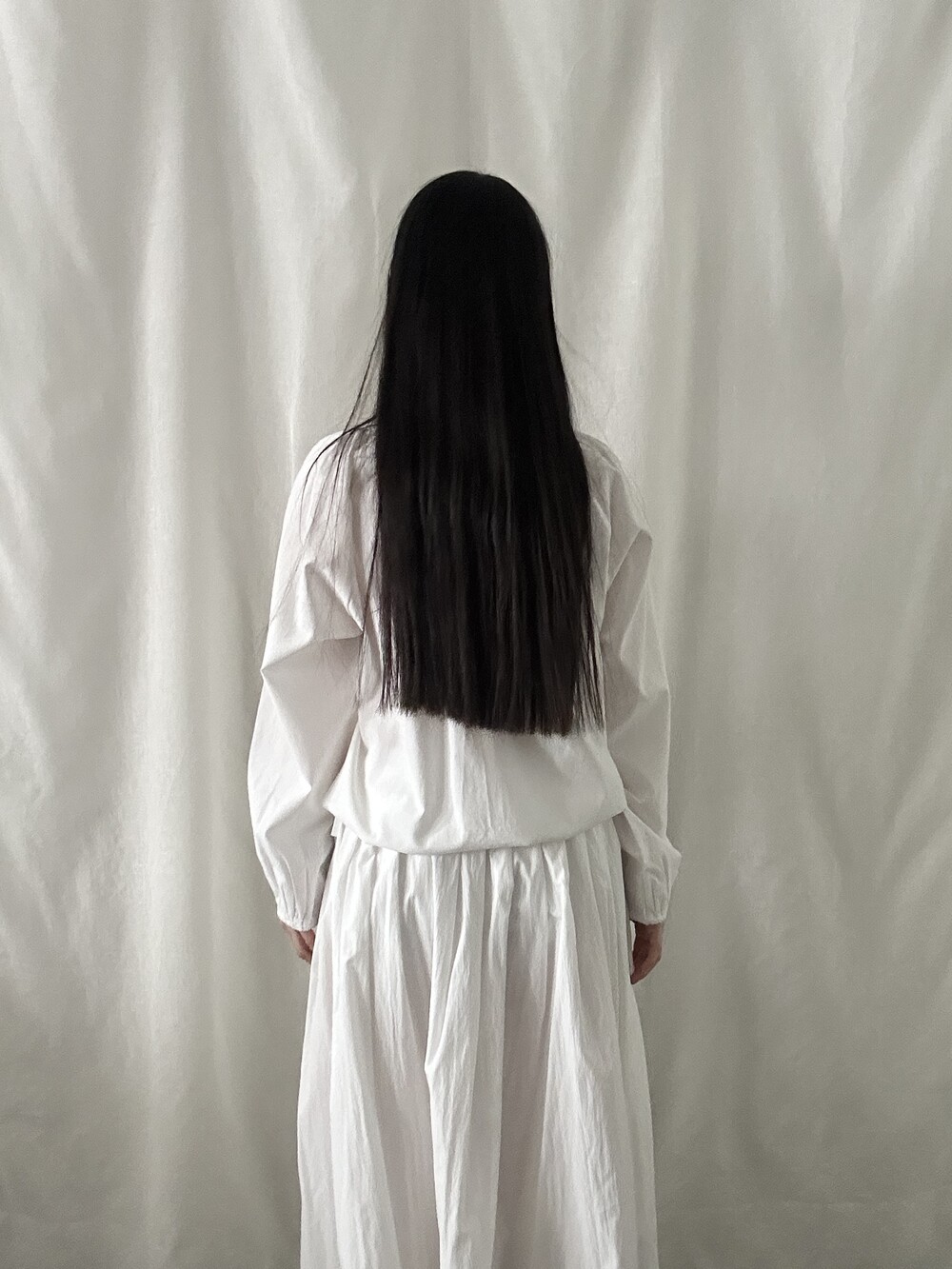 소매 끝단은 밴딩으로 처리해 소매를 걷어 올리고 내리기 편안함은 물론 자연스럽게 잡힌 셔링은 넥라인 셔링과 조화롭게 이루어져 페미닌한 무드를 극대화 해줍니다.