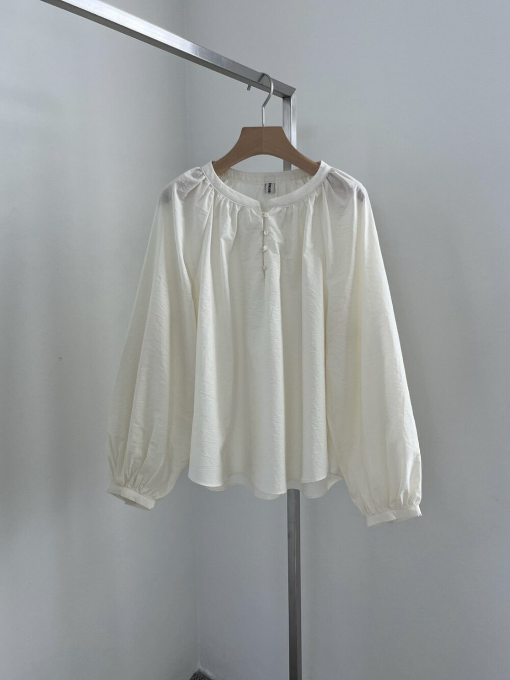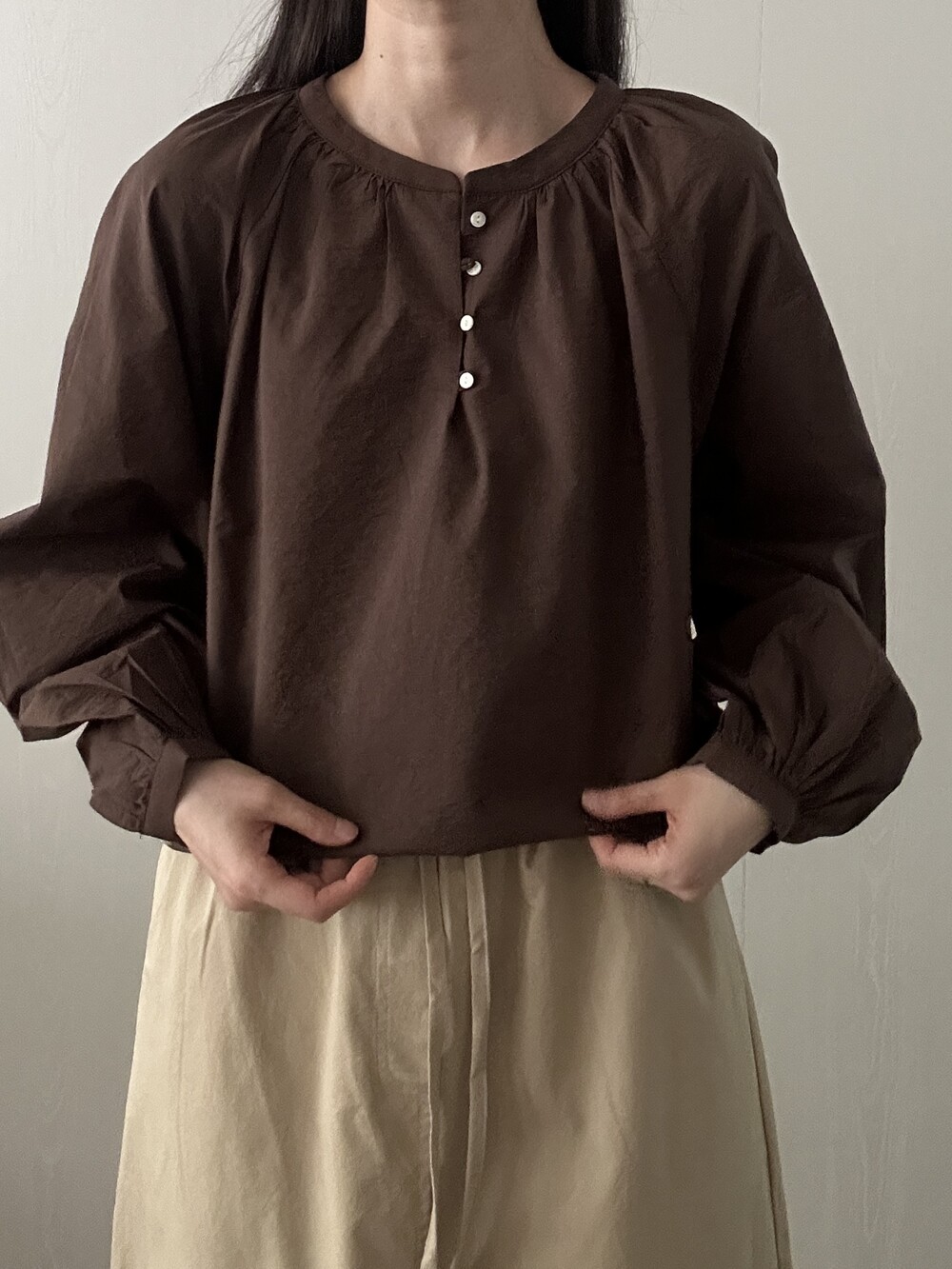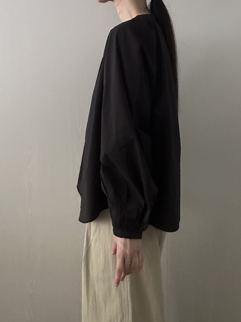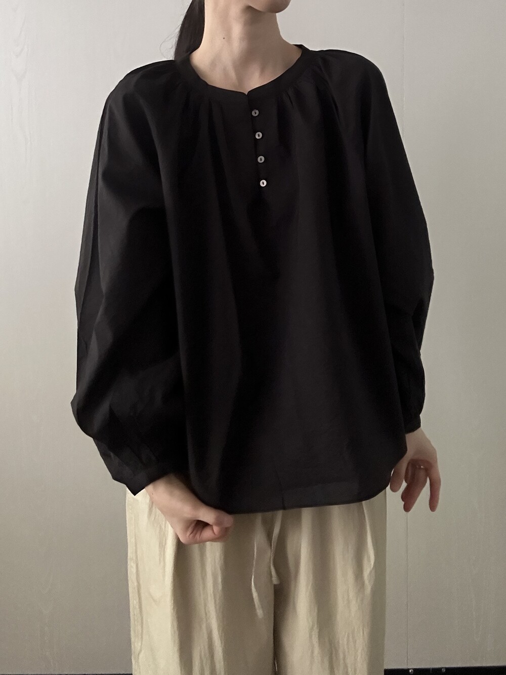 네크라인에 셔링이 매력적인 라글란 블라우스입니다.