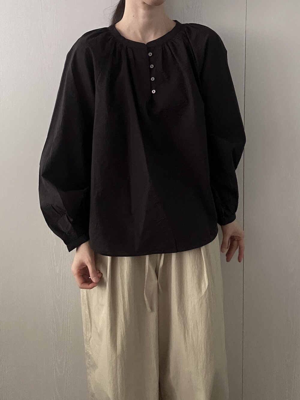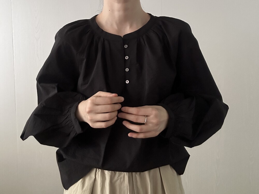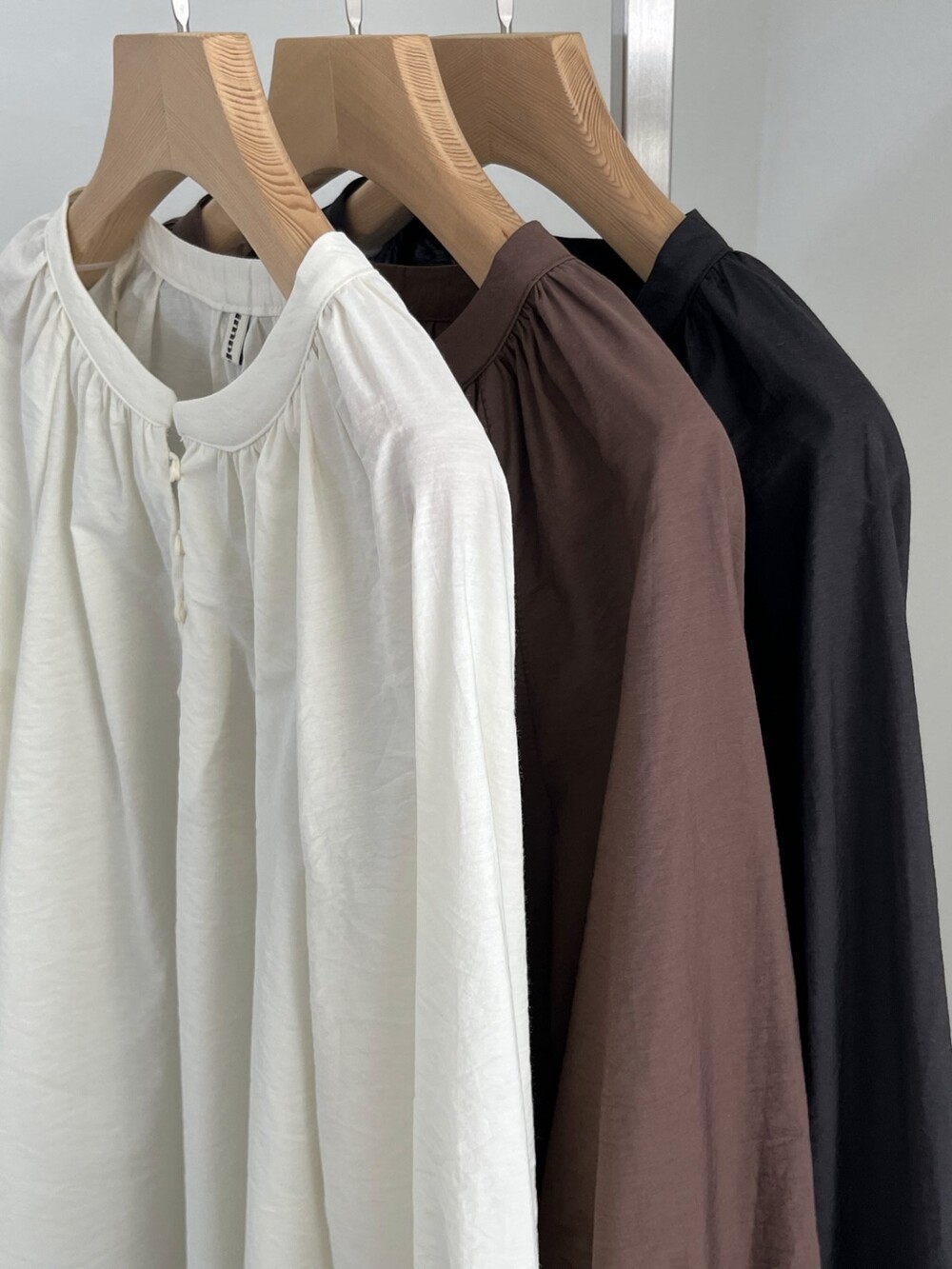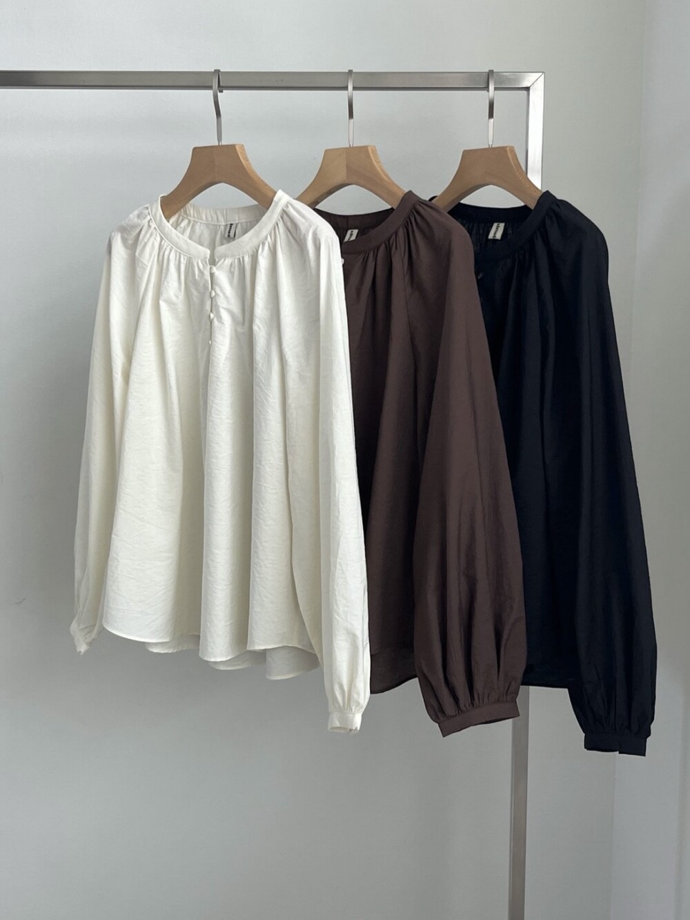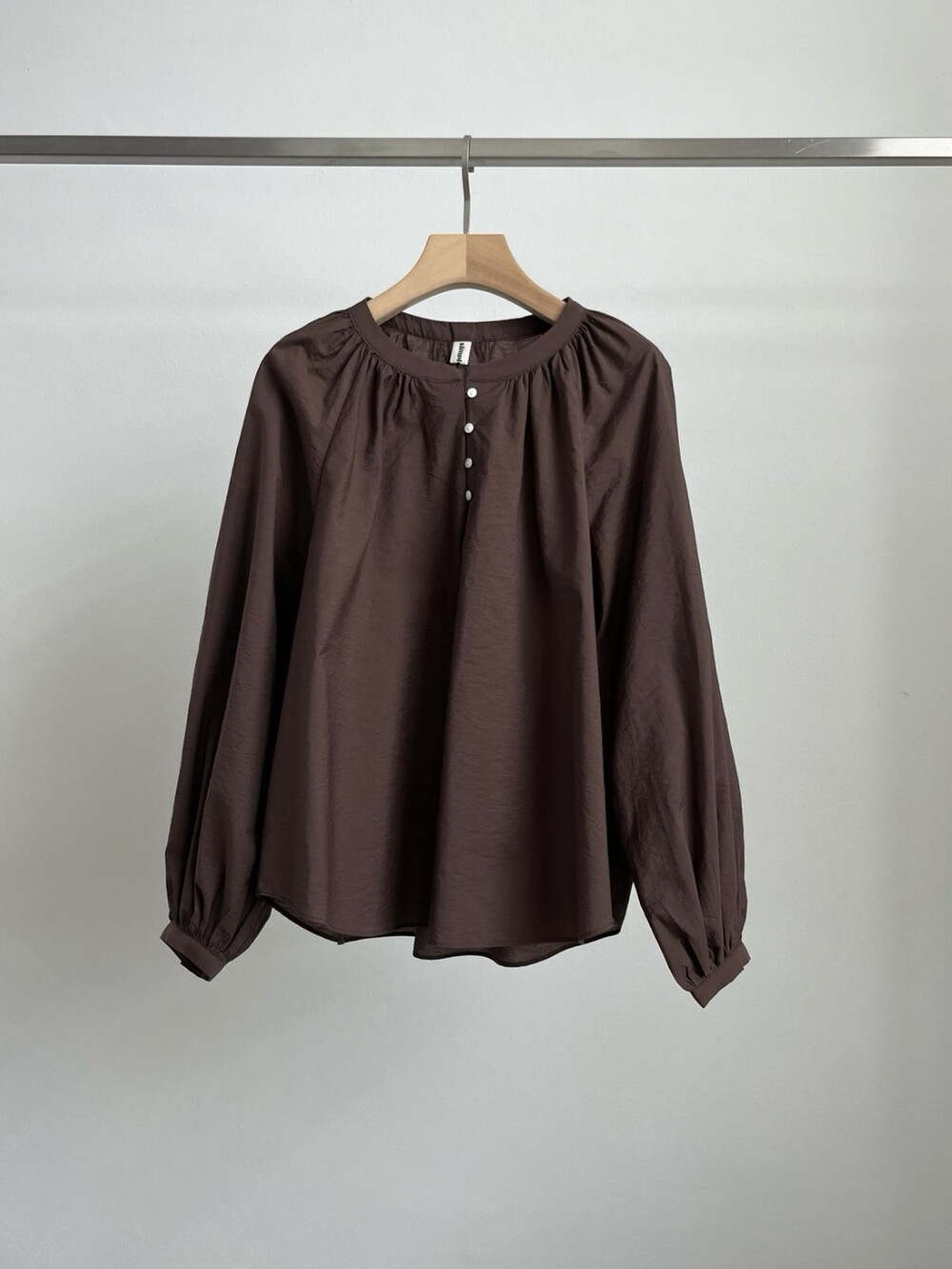 네크라인에 셔링이 매력적인 라글란 블라우스입니다.