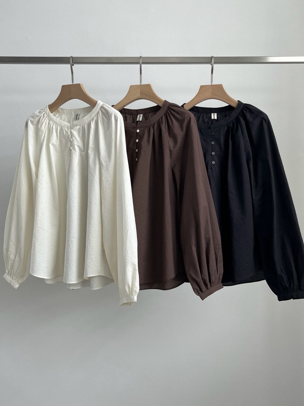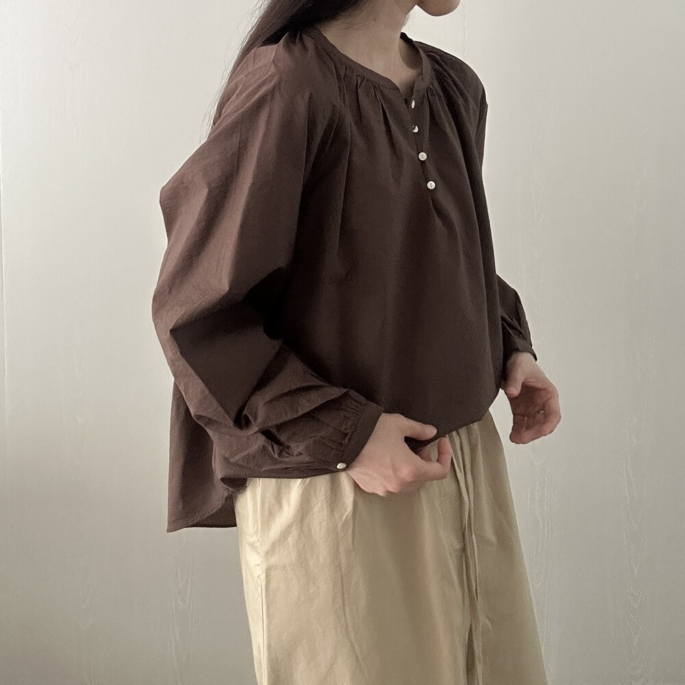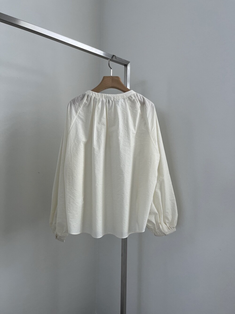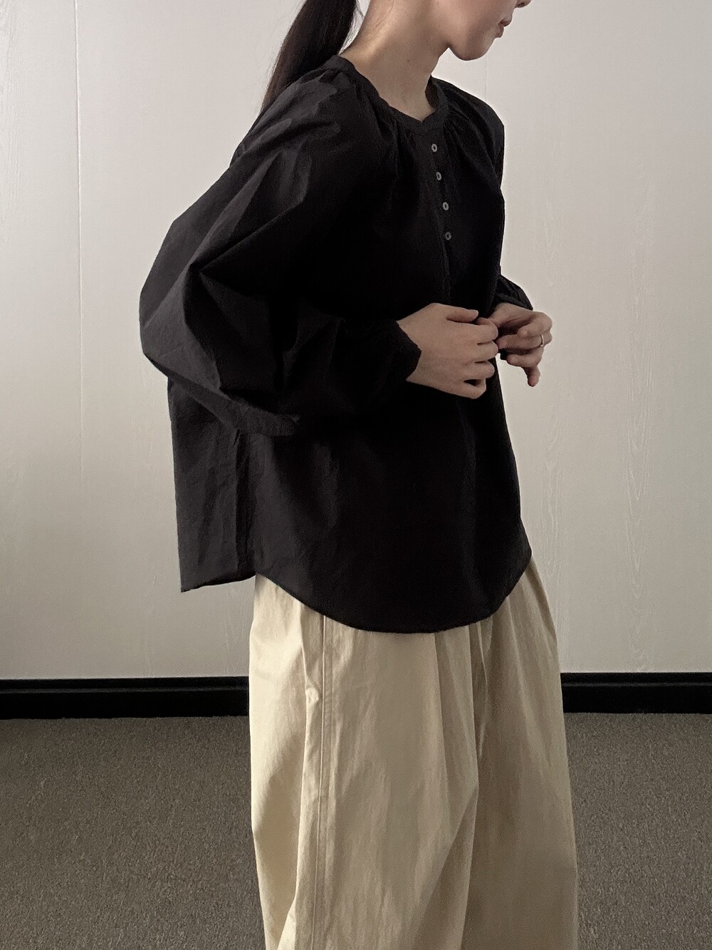 네크라인에 셔링이 매력적인 라글란 블라우스입니다.