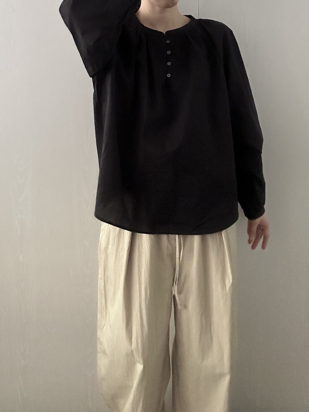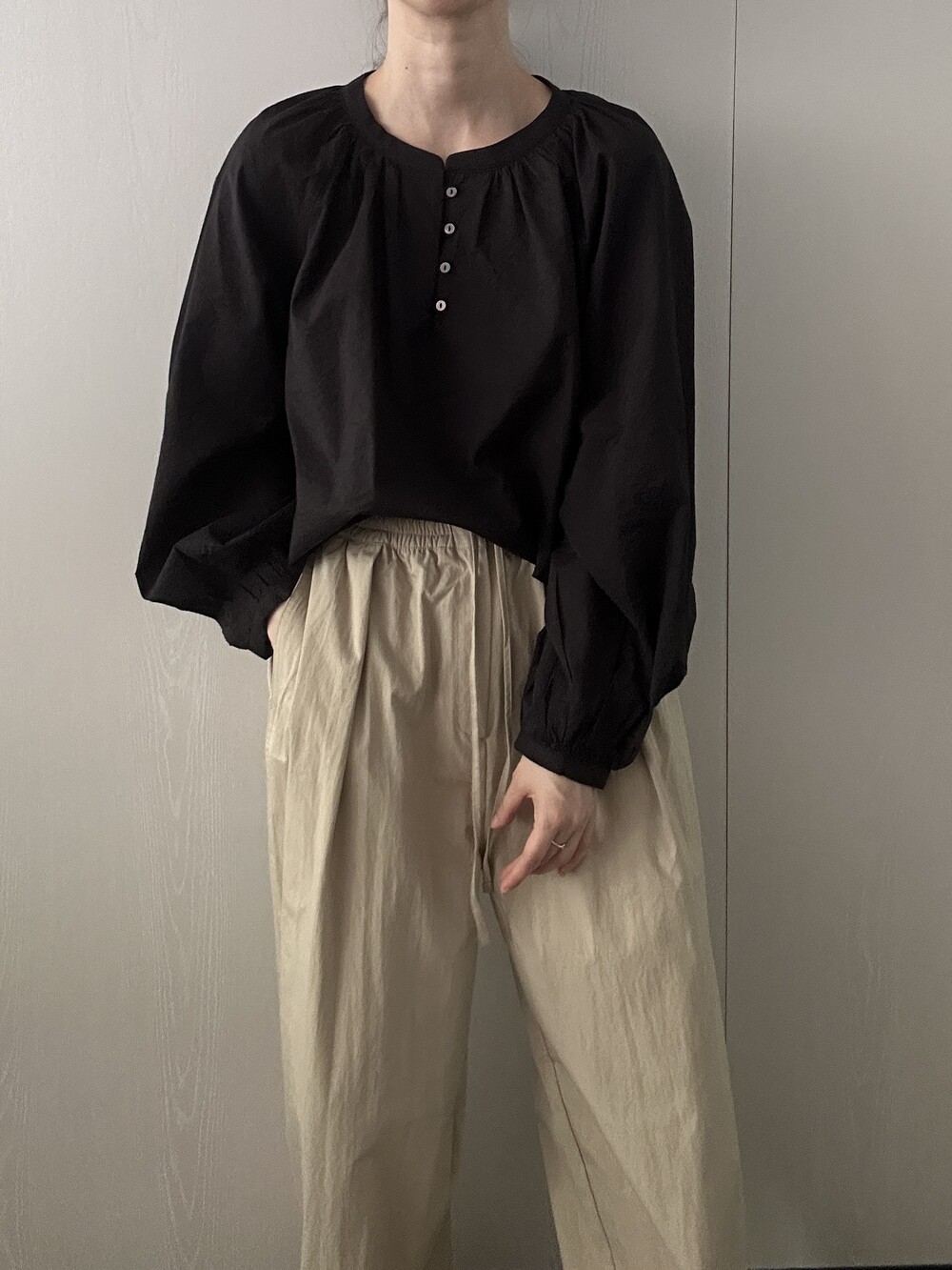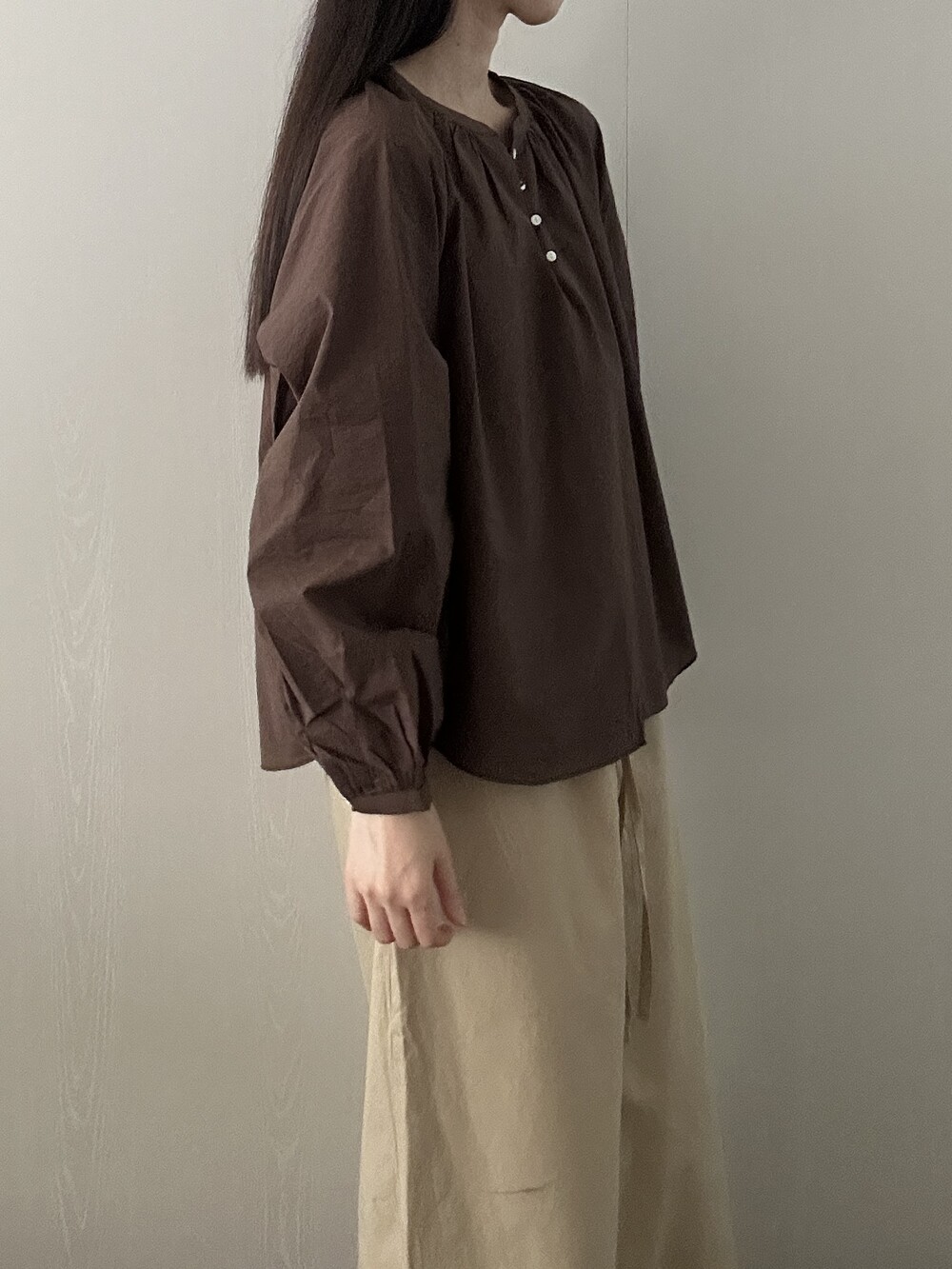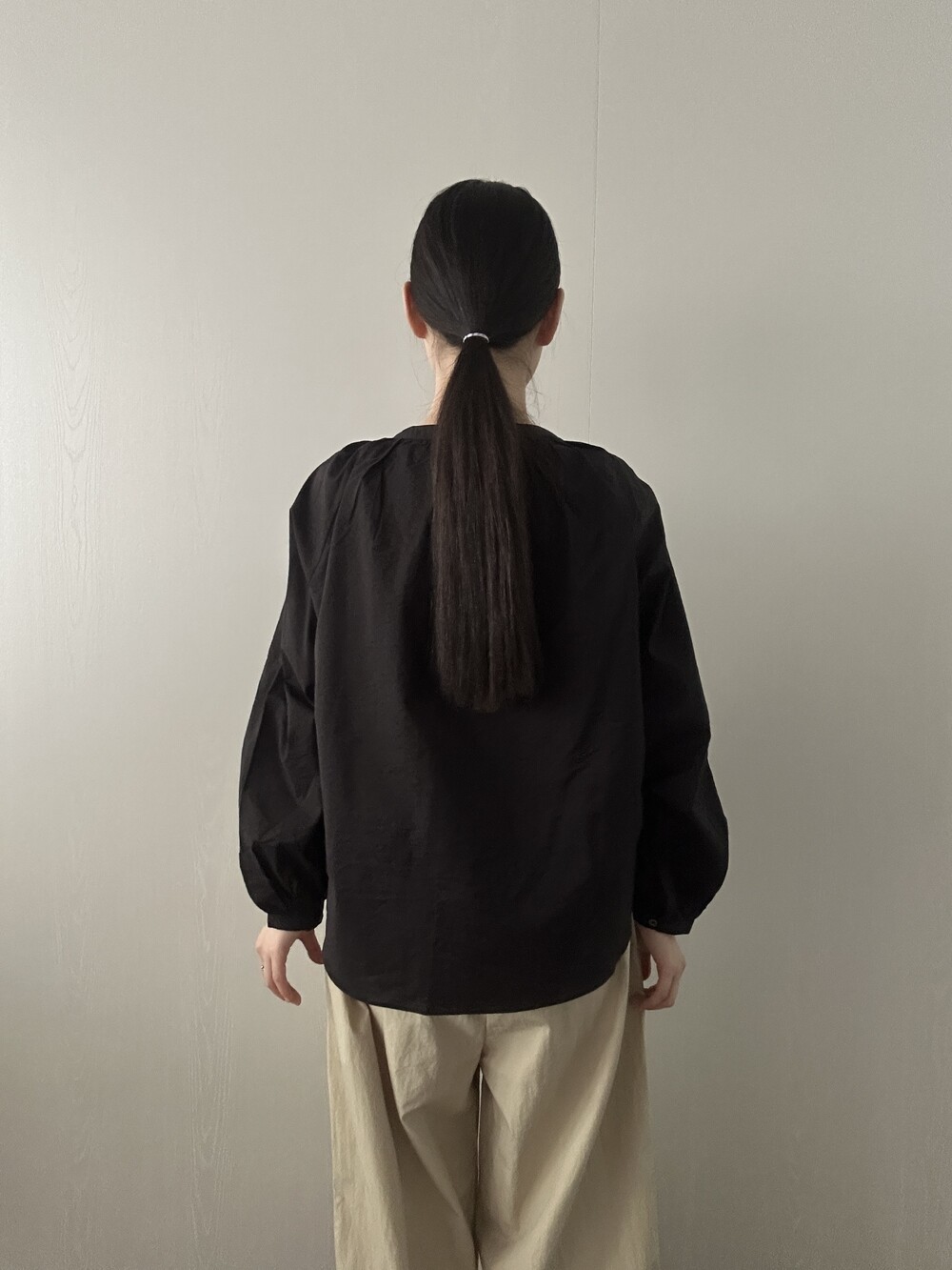 네크라인에 셔링이 매력적인 라글란 블라우스입니다.