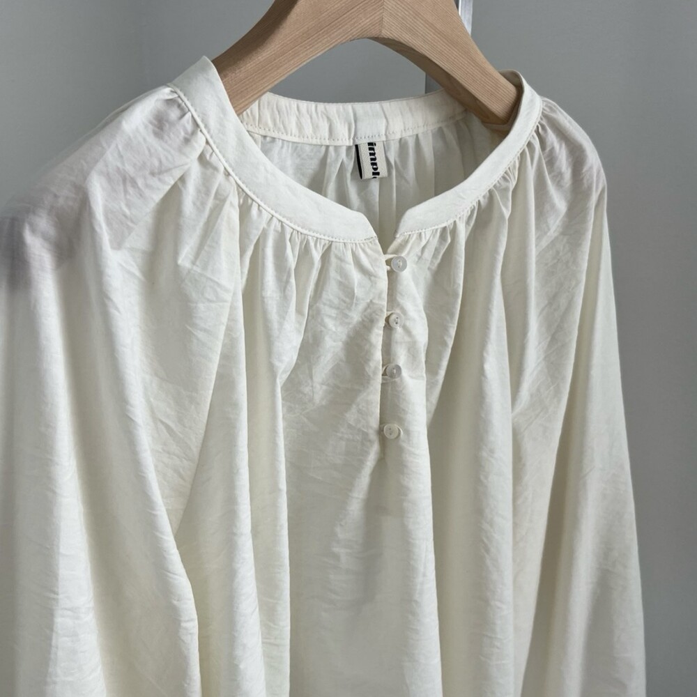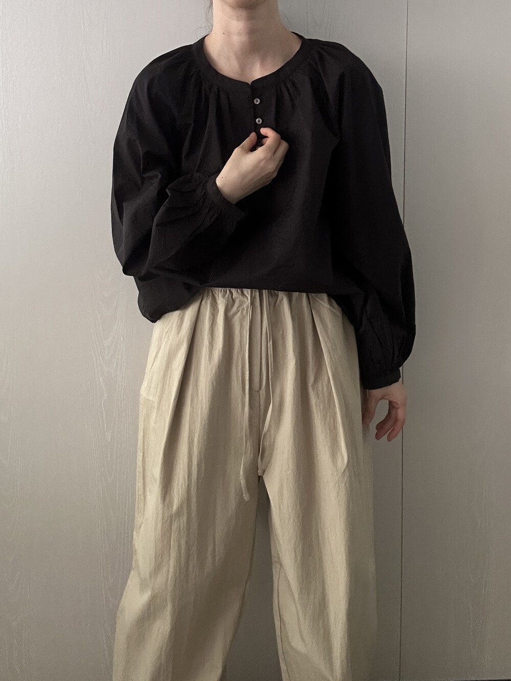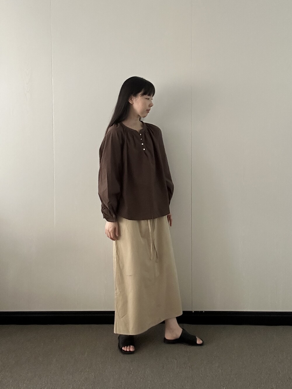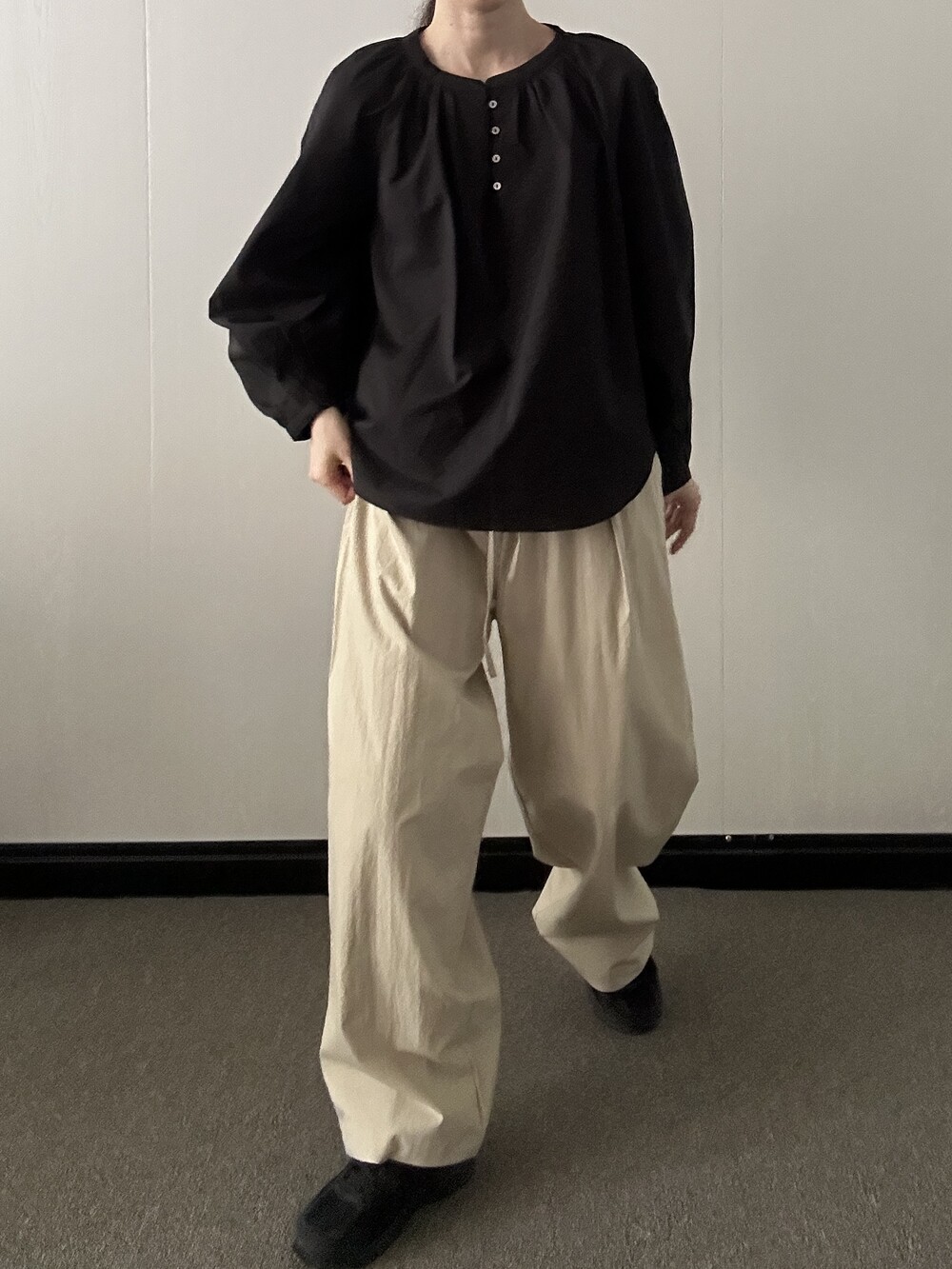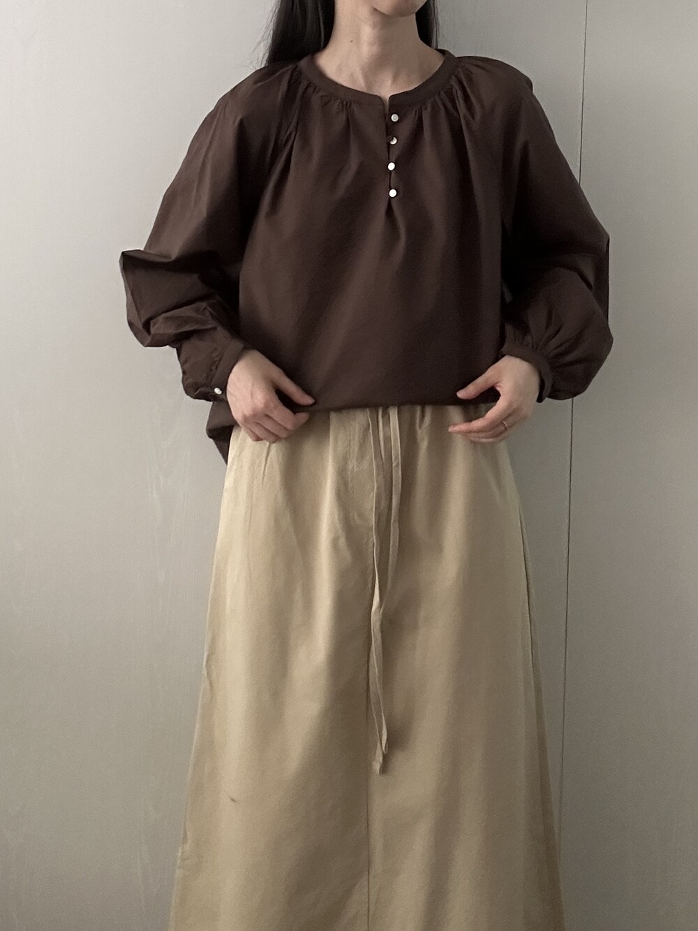 네크라인에 셔링이 매력적인 라글란 블라우스입니다.