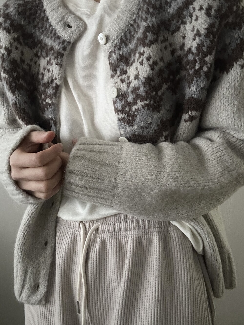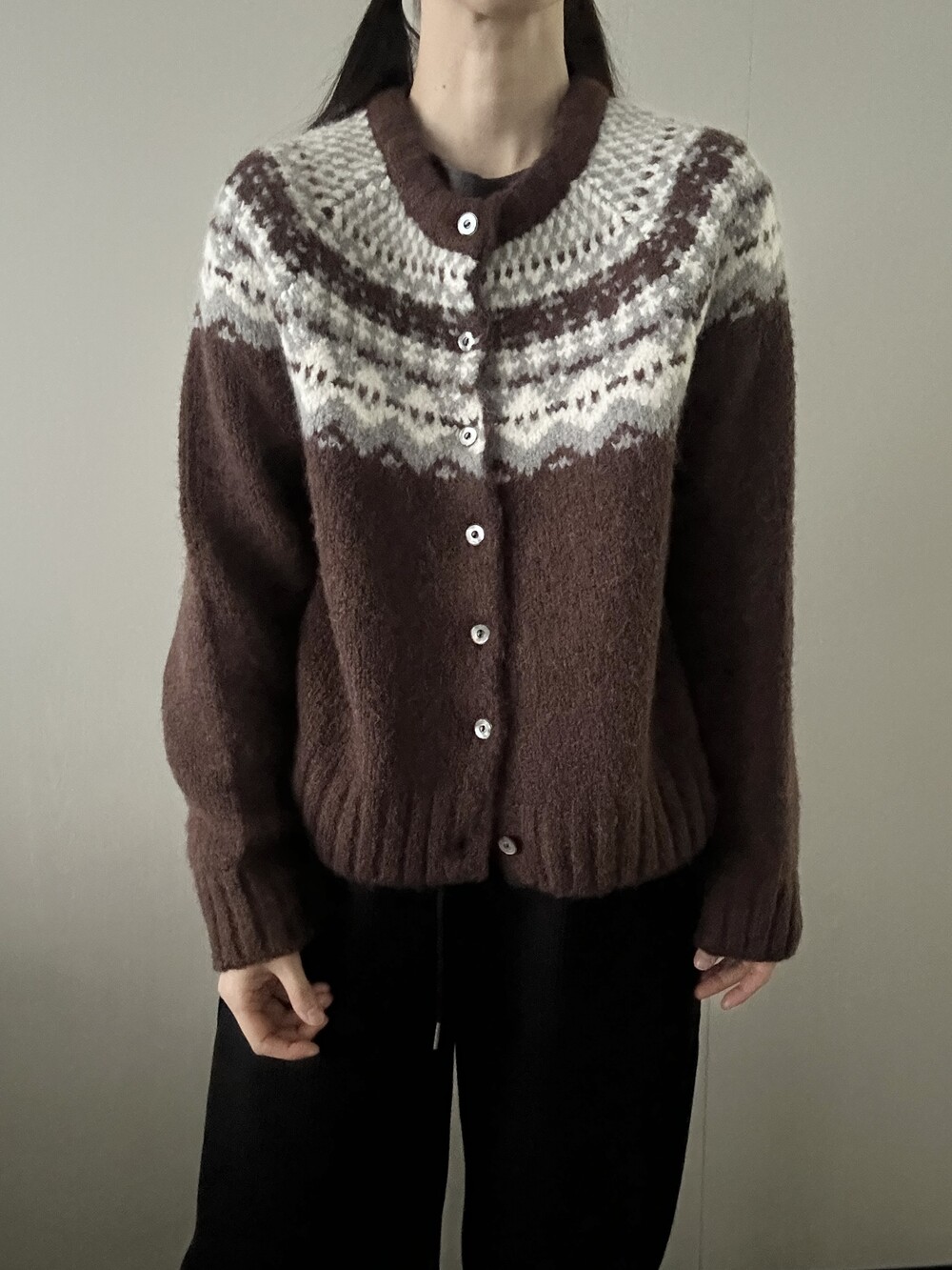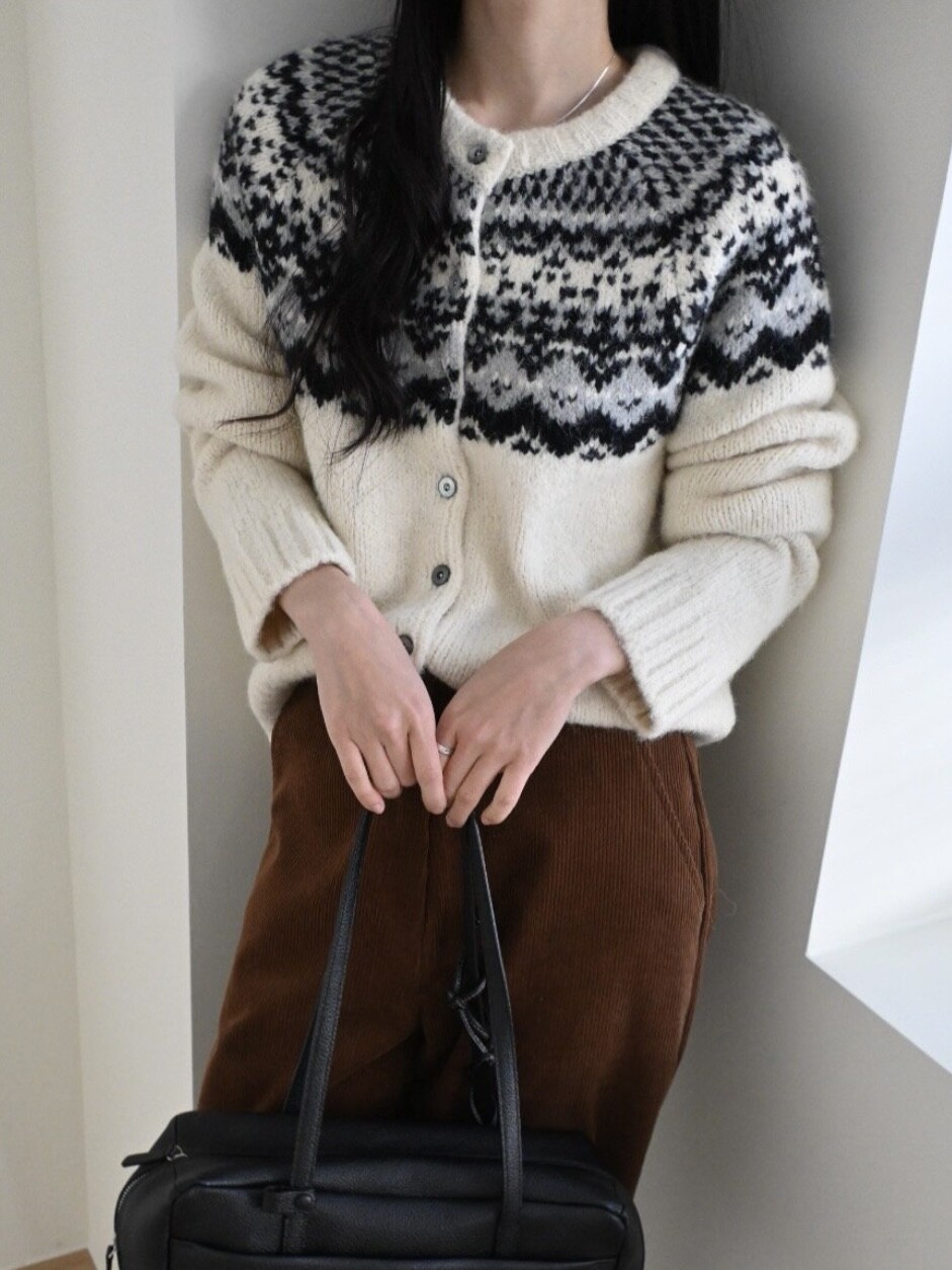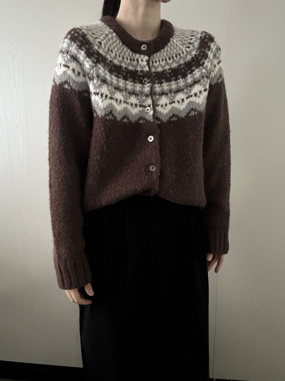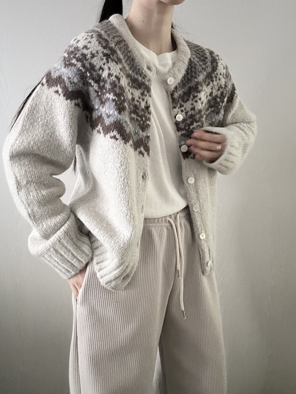 자가드 패턴이 아일랜드나 스코틀랜드 가디건을 떠올리게 하며 컬러 조합이 고급스럽습니다.