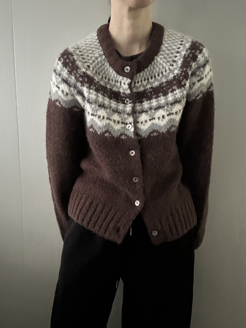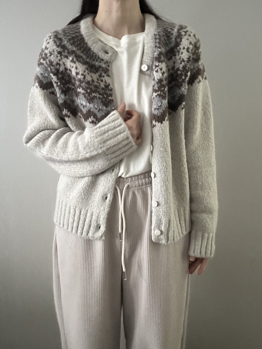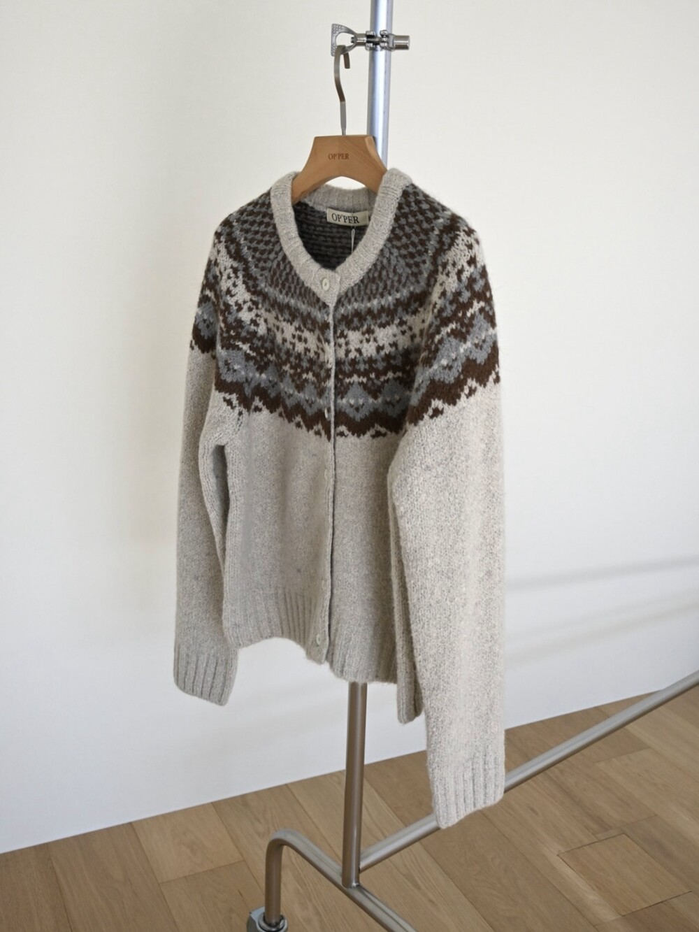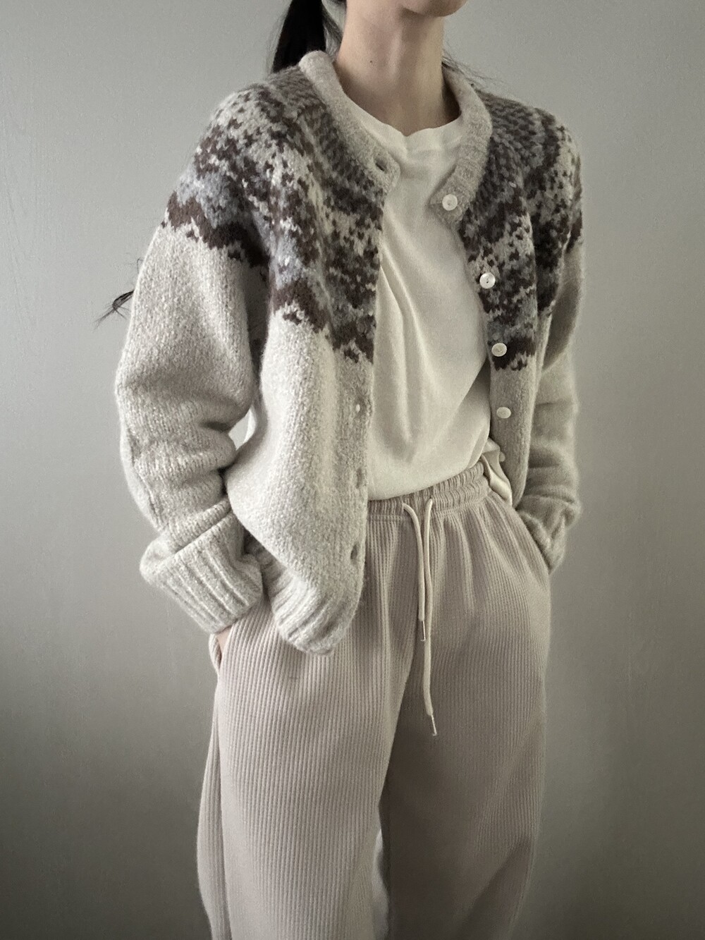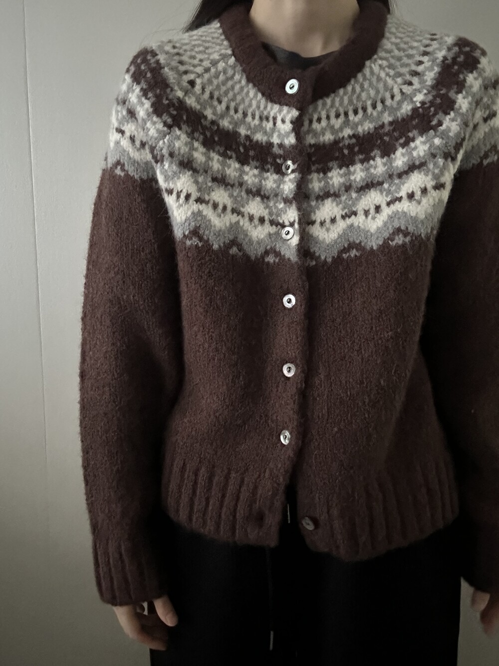 자가드 패턴이 아일랜드나 스코틀랜드 가디건을 떠올리게 하며 컬러 조합이 고급스럽습니다.