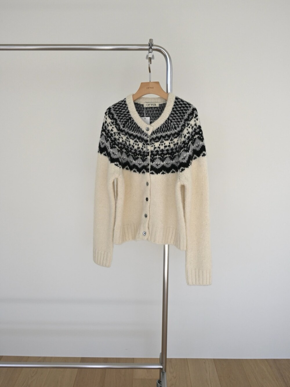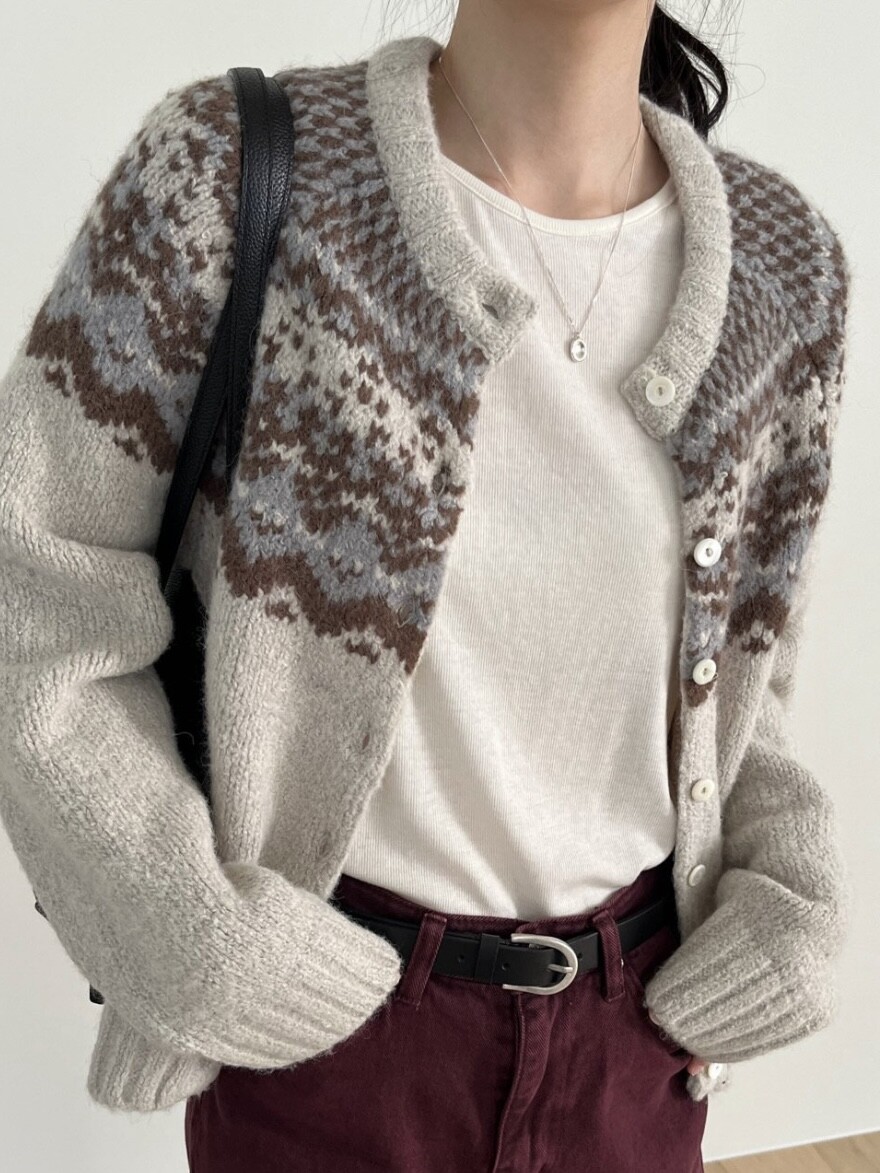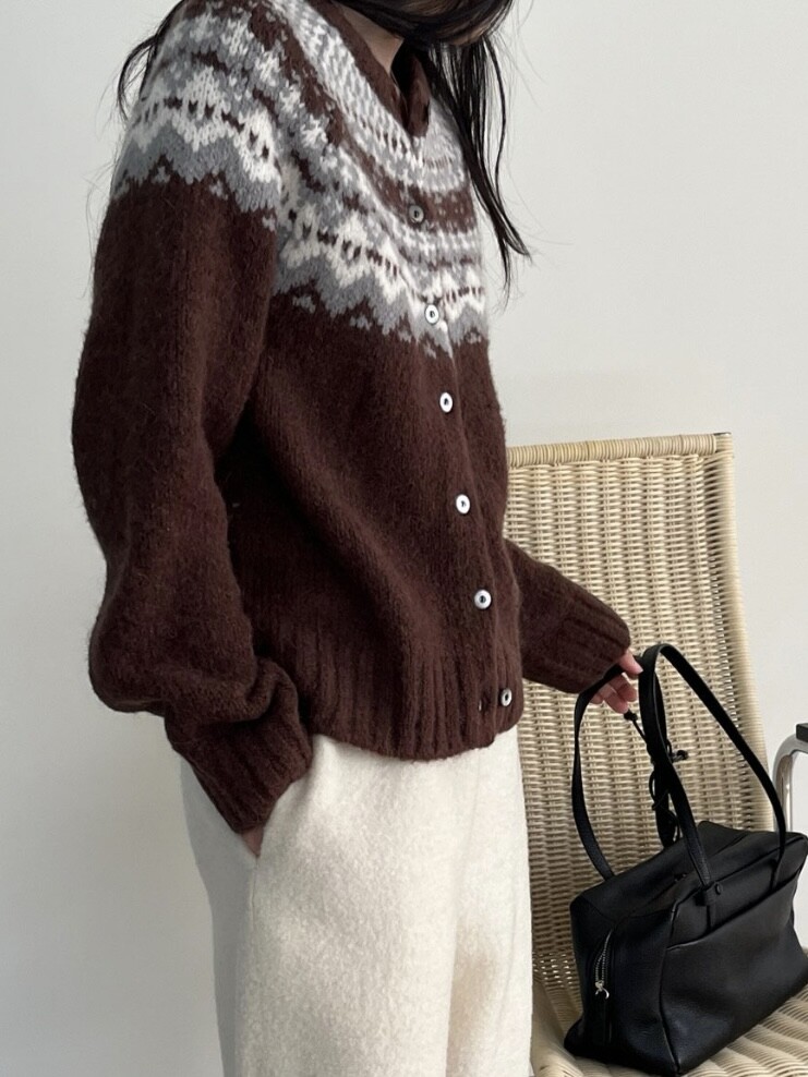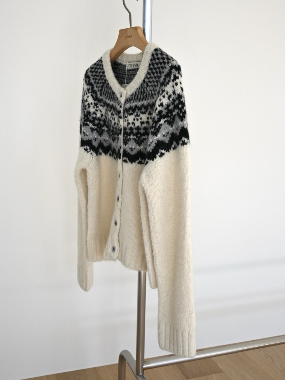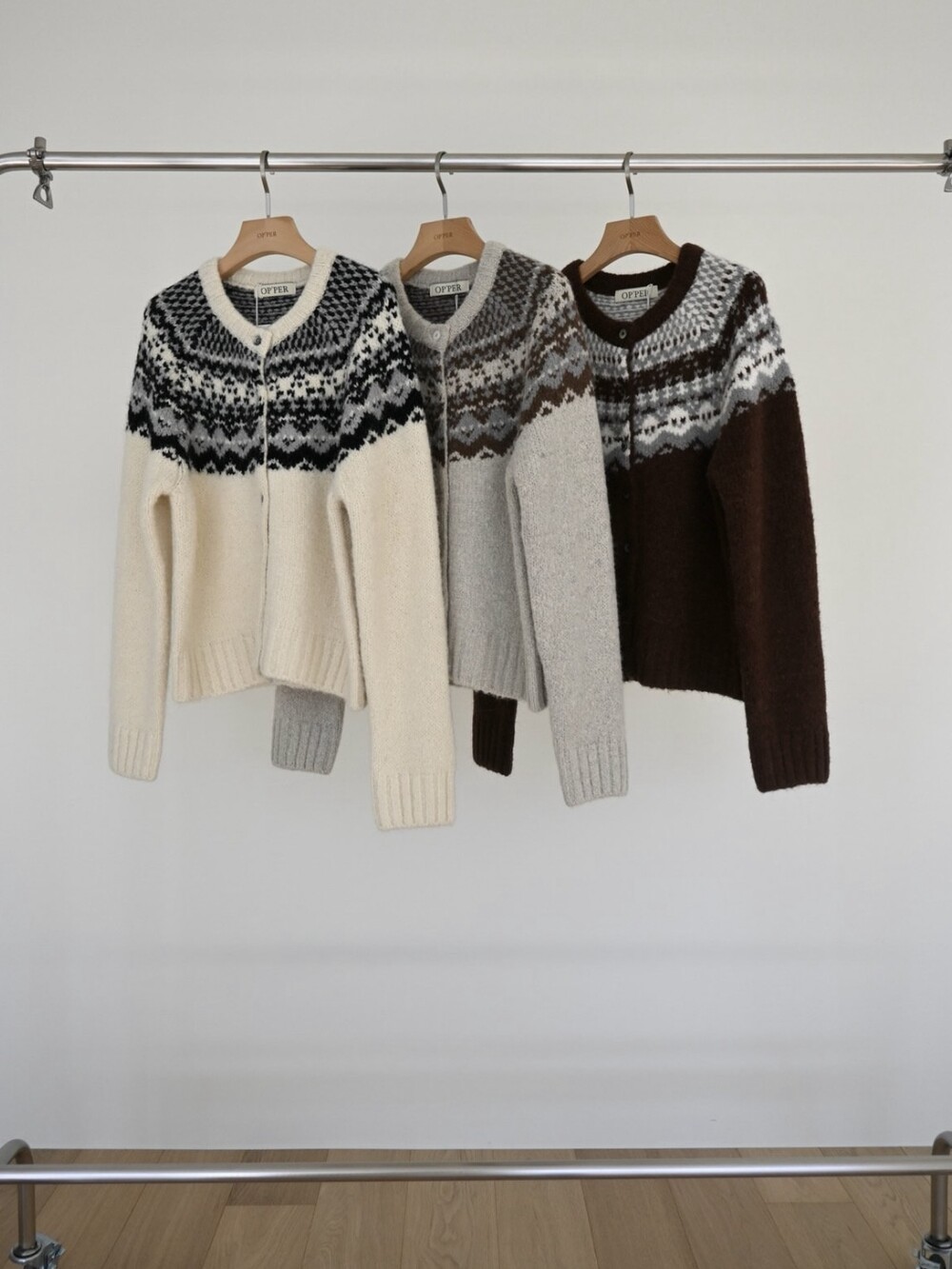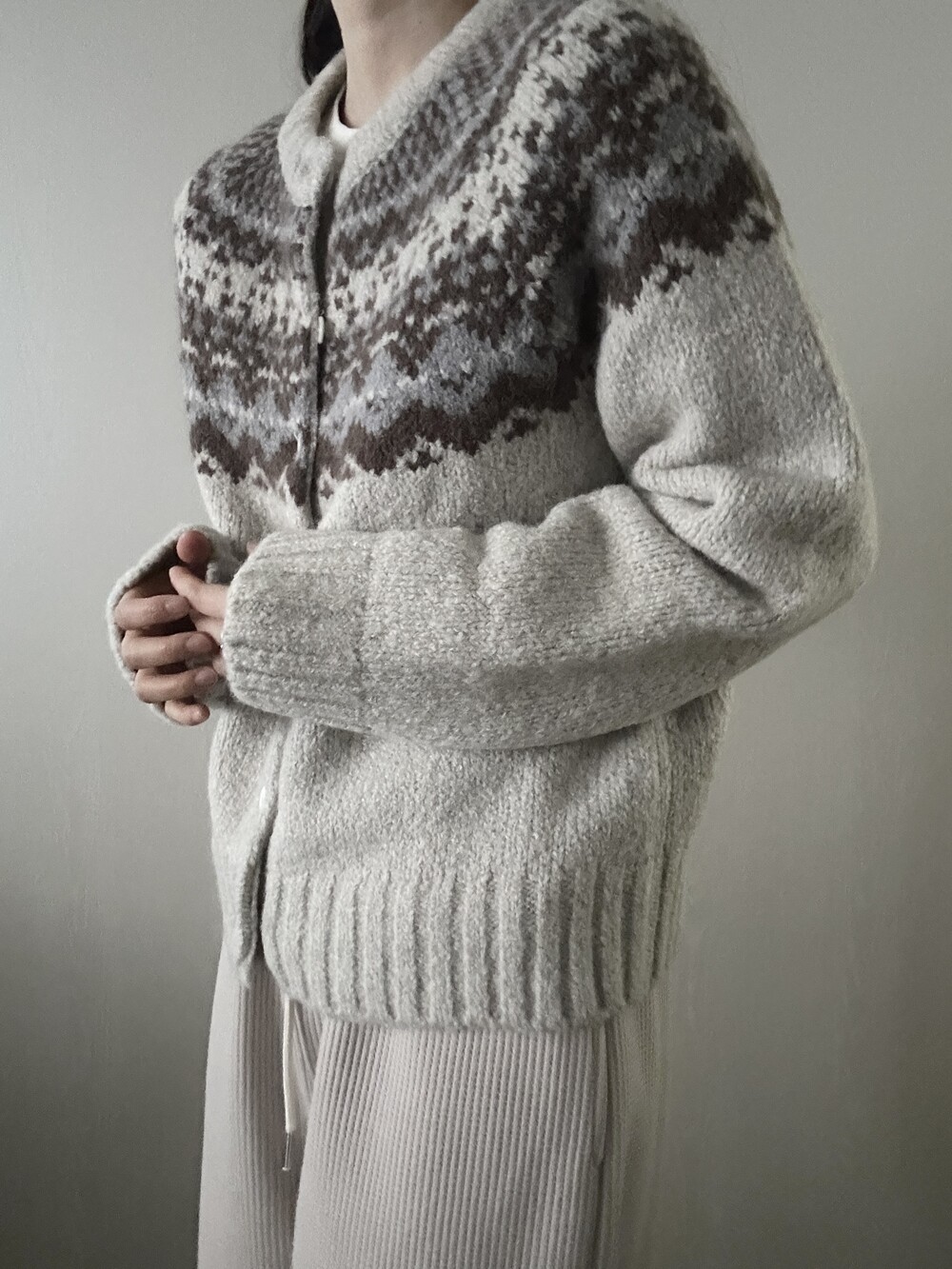 자가드 패턴이 아일랜드나 스코틀랜드 가디건을 떠올리게 하며 컬러 조합이 고급스럽습니다.