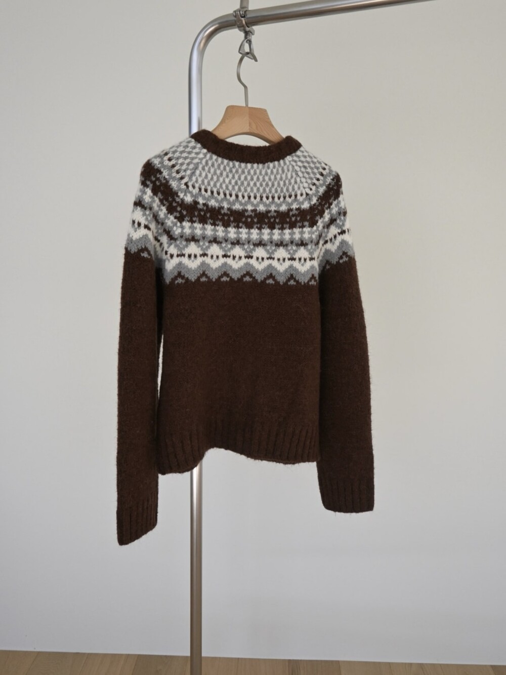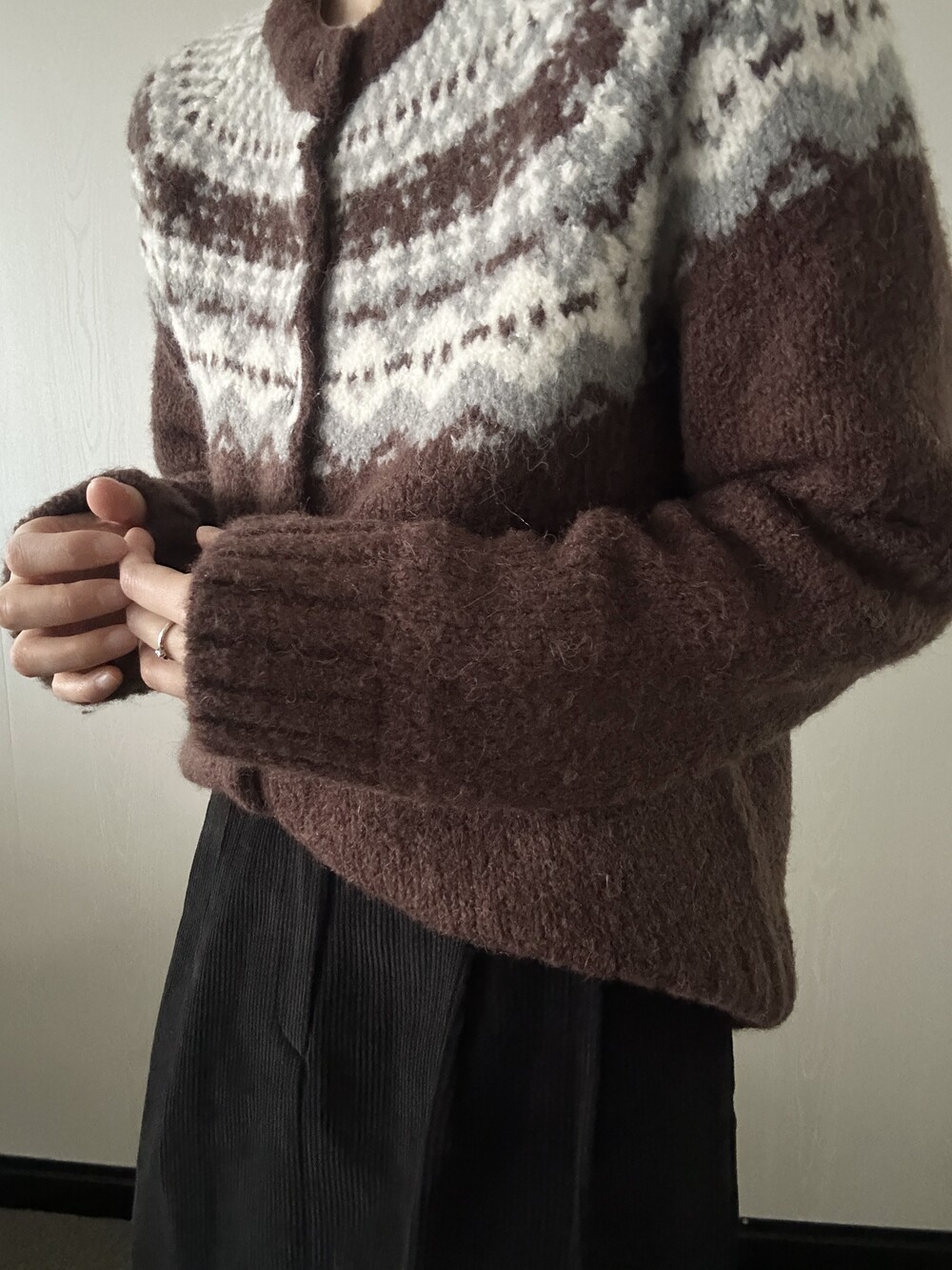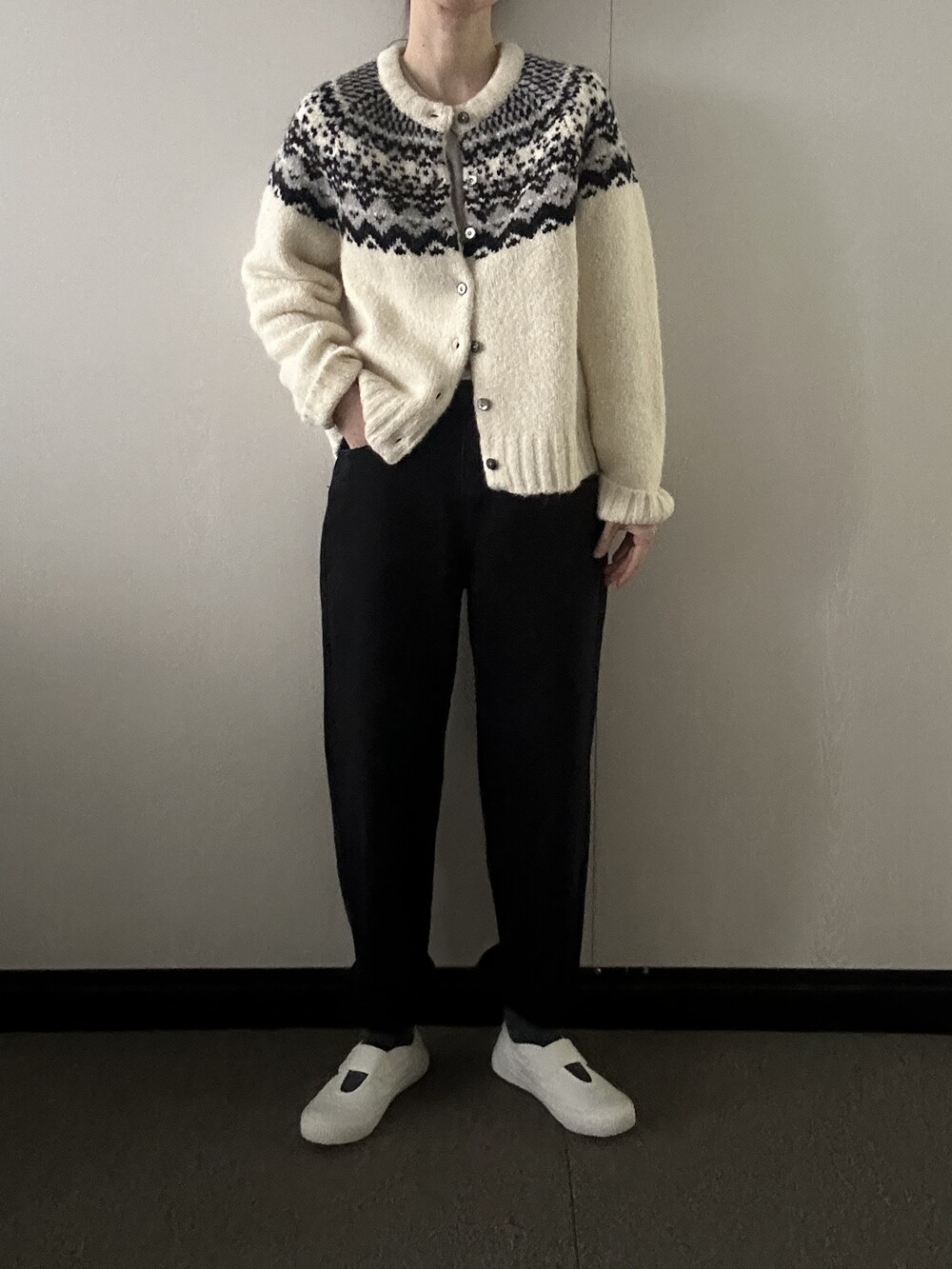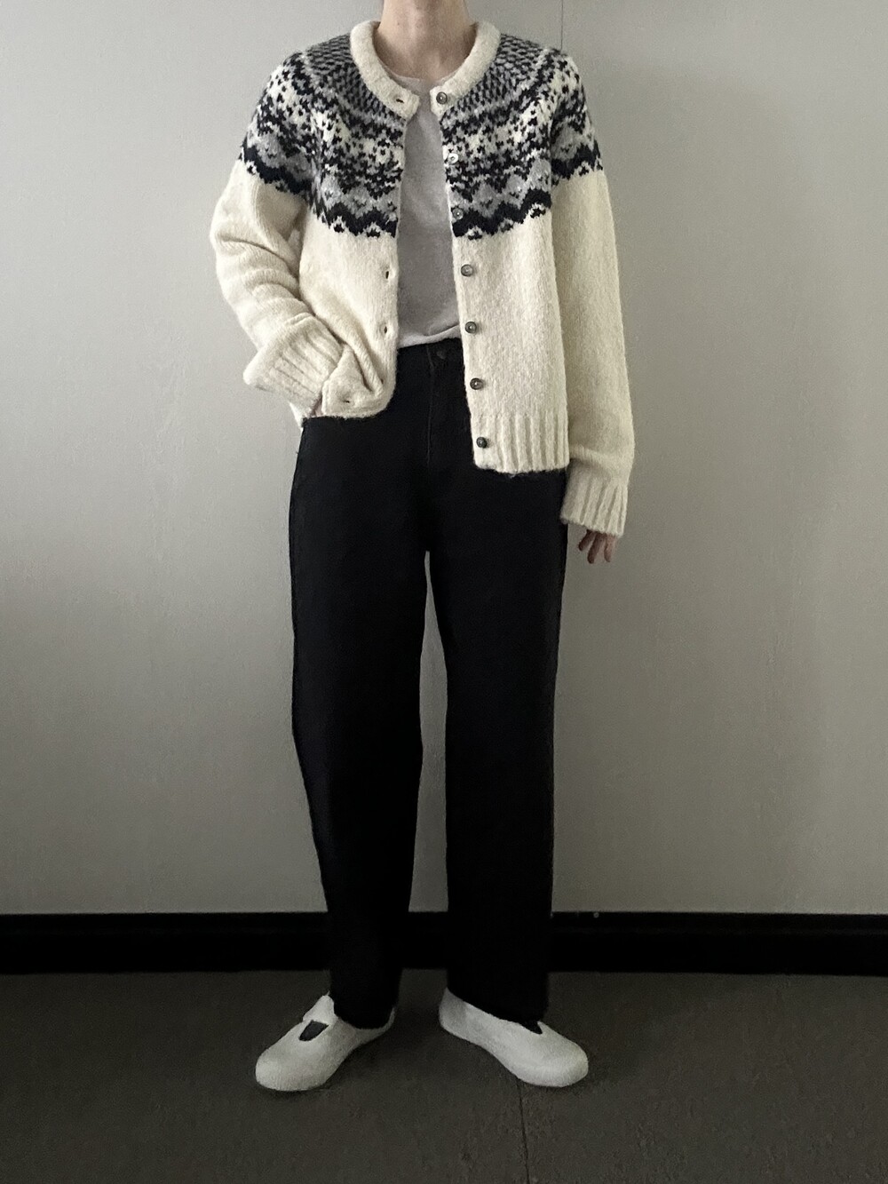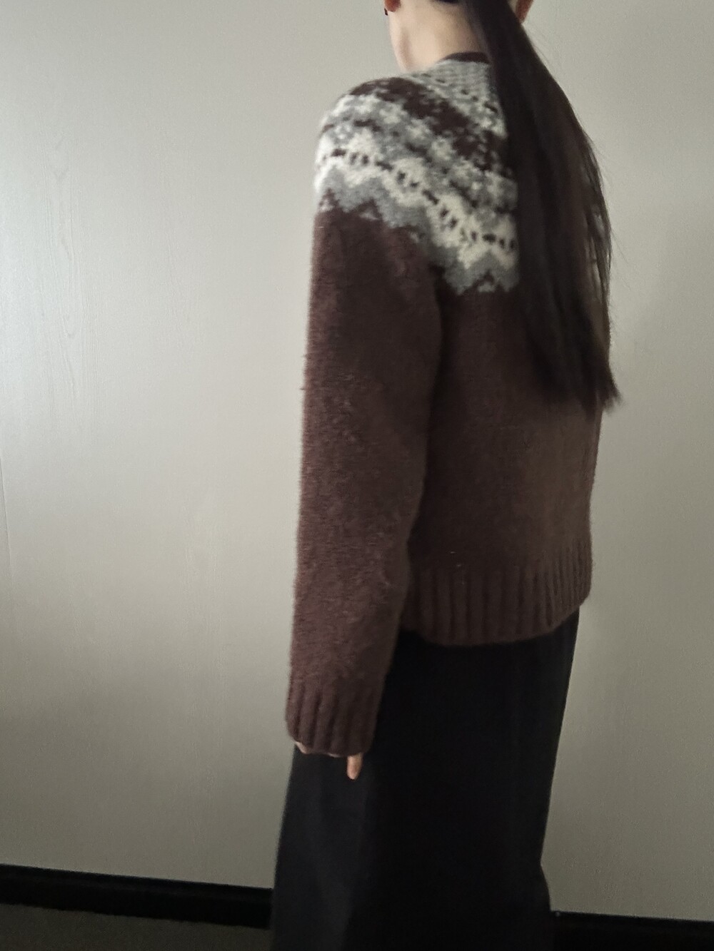 자가드 패턴이 아일랜드나 스코틀랜드 가디건을 떠올리게 하며 컬러 조합이 고급스럽습니다.