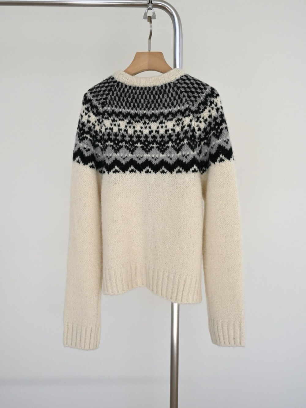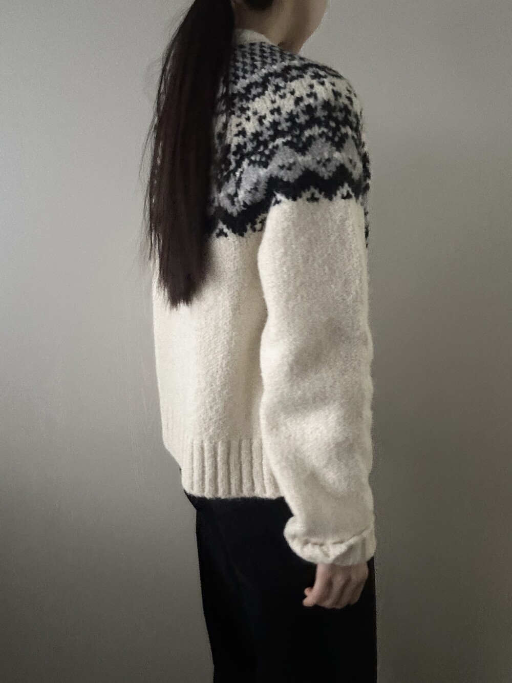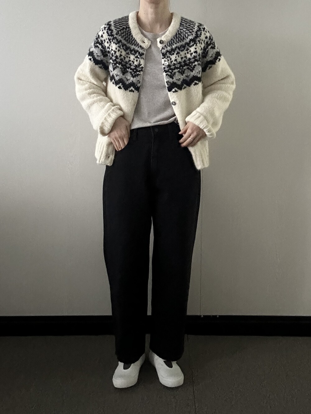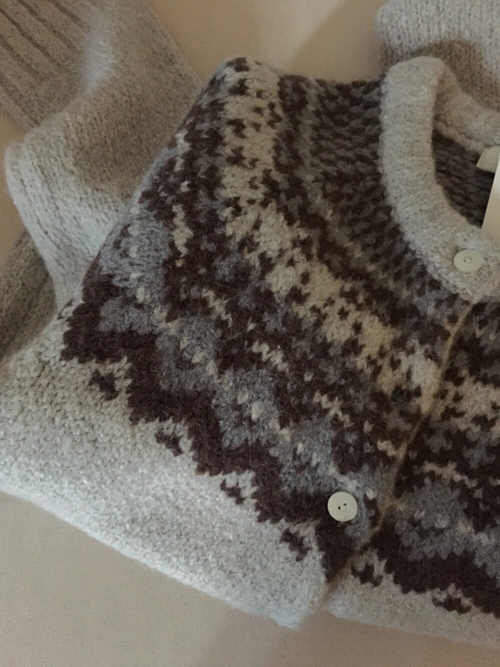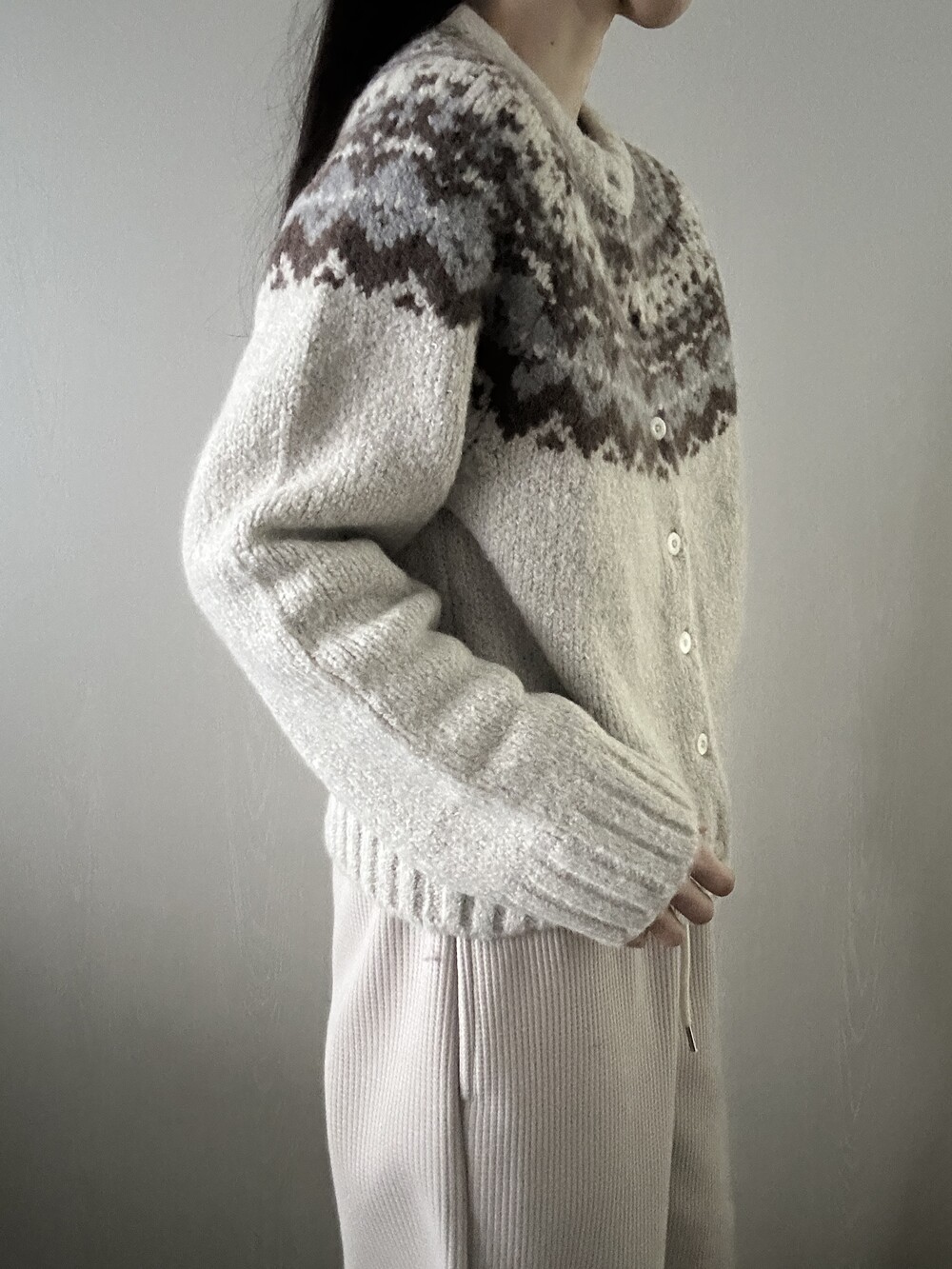 자가드 패턴이 아일랜드나 스코틀랜드 가디건을 떠올리게 하며 컬러 조합이 고급스럽습니다.