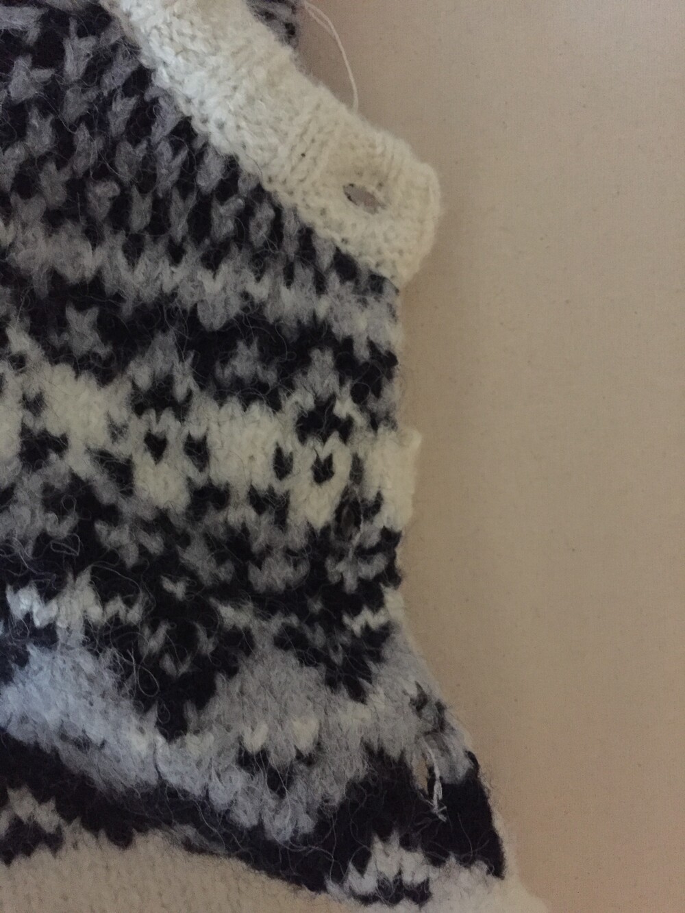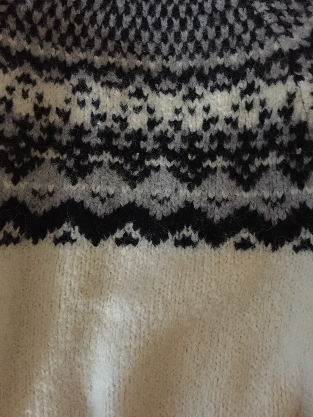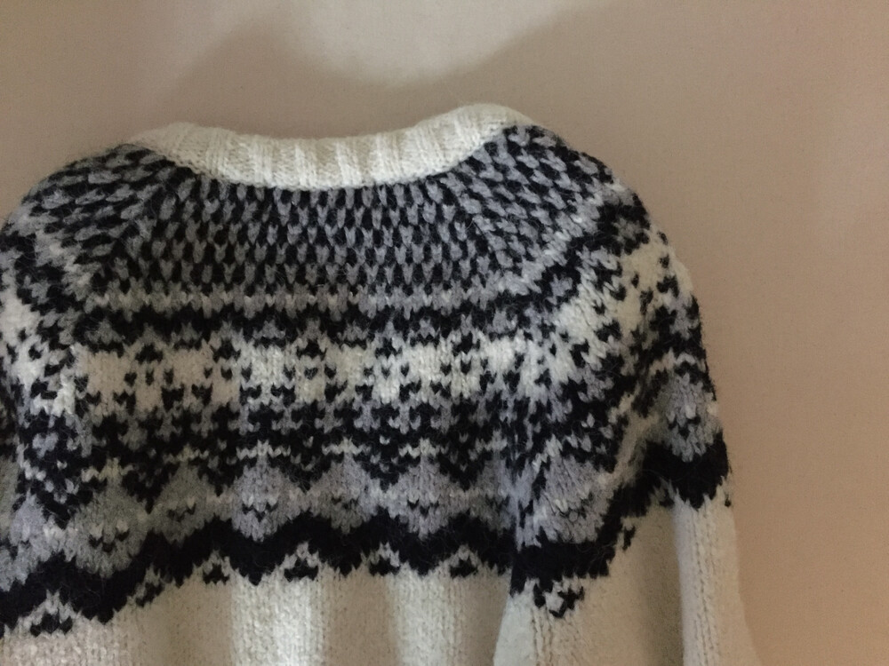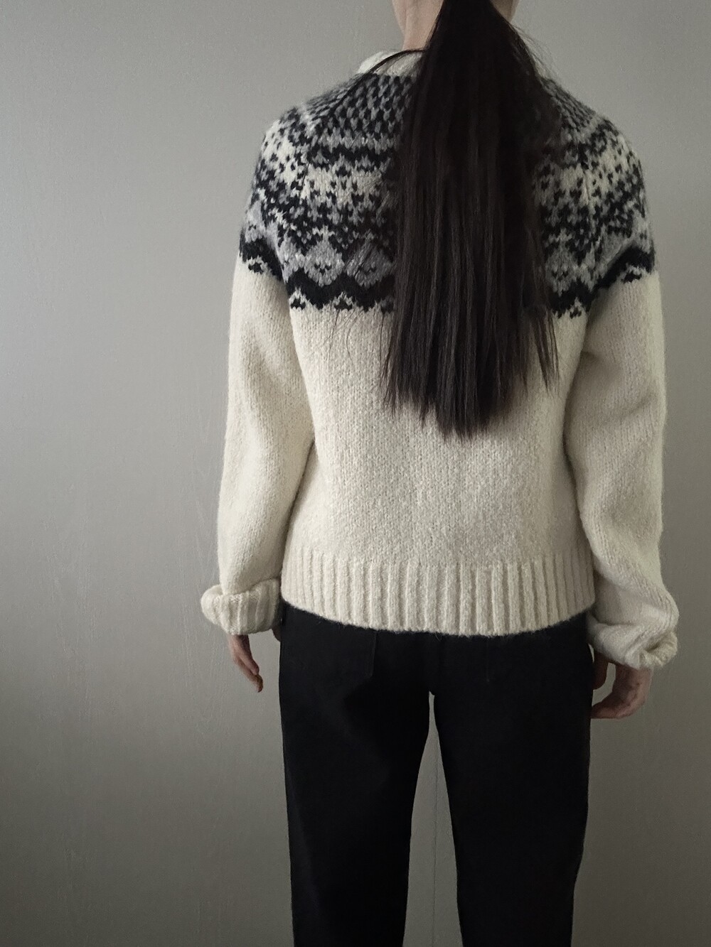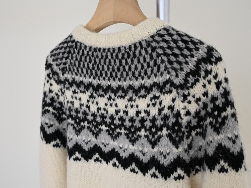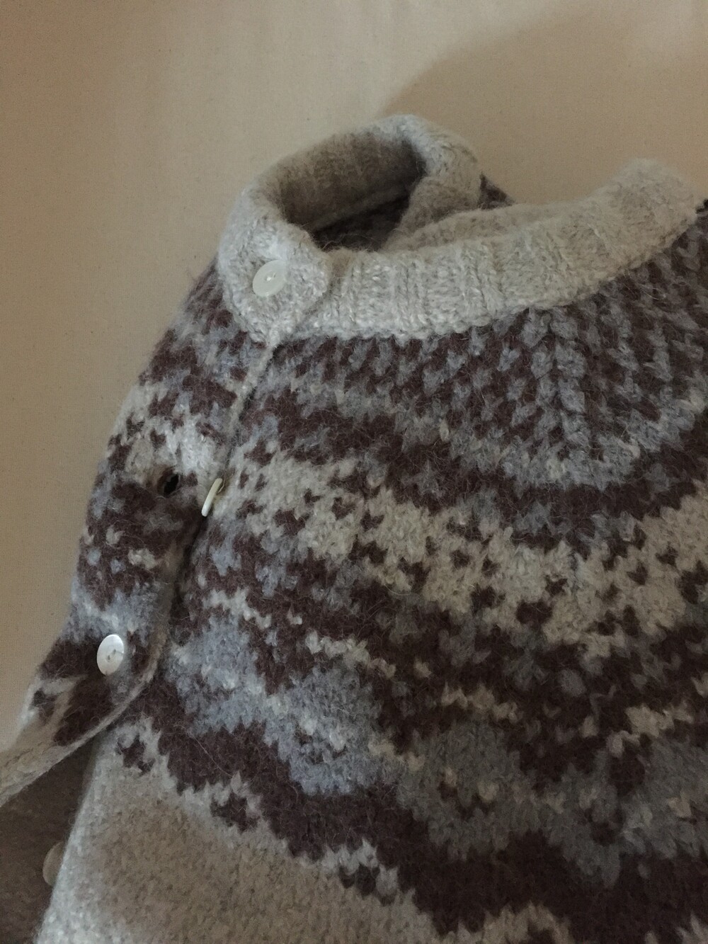 자가드 패턴이 아일랜드나 스코틀랜드 가디건을 떠올리게 하며 컬러 조합이 고급스럽습니다.
