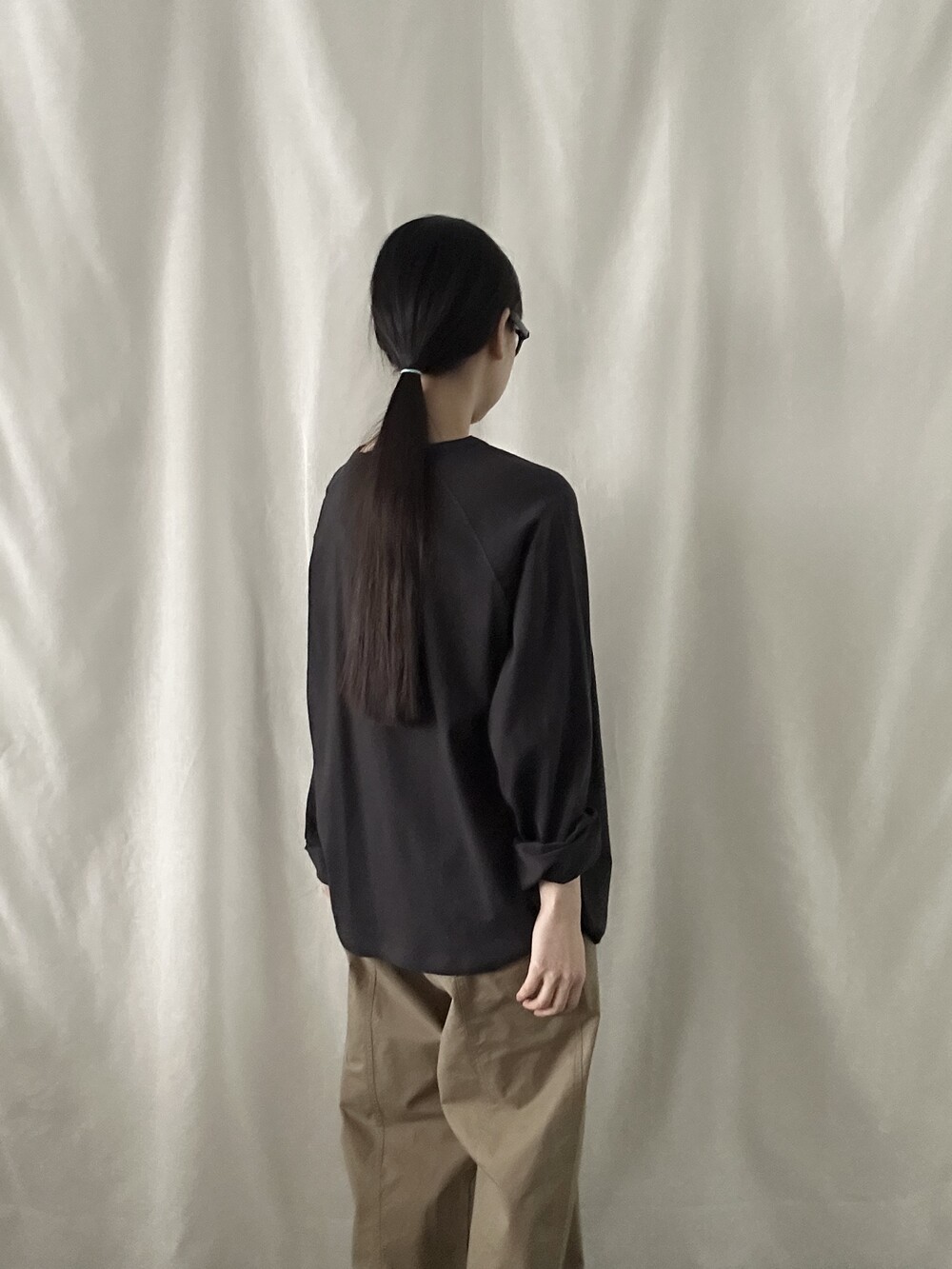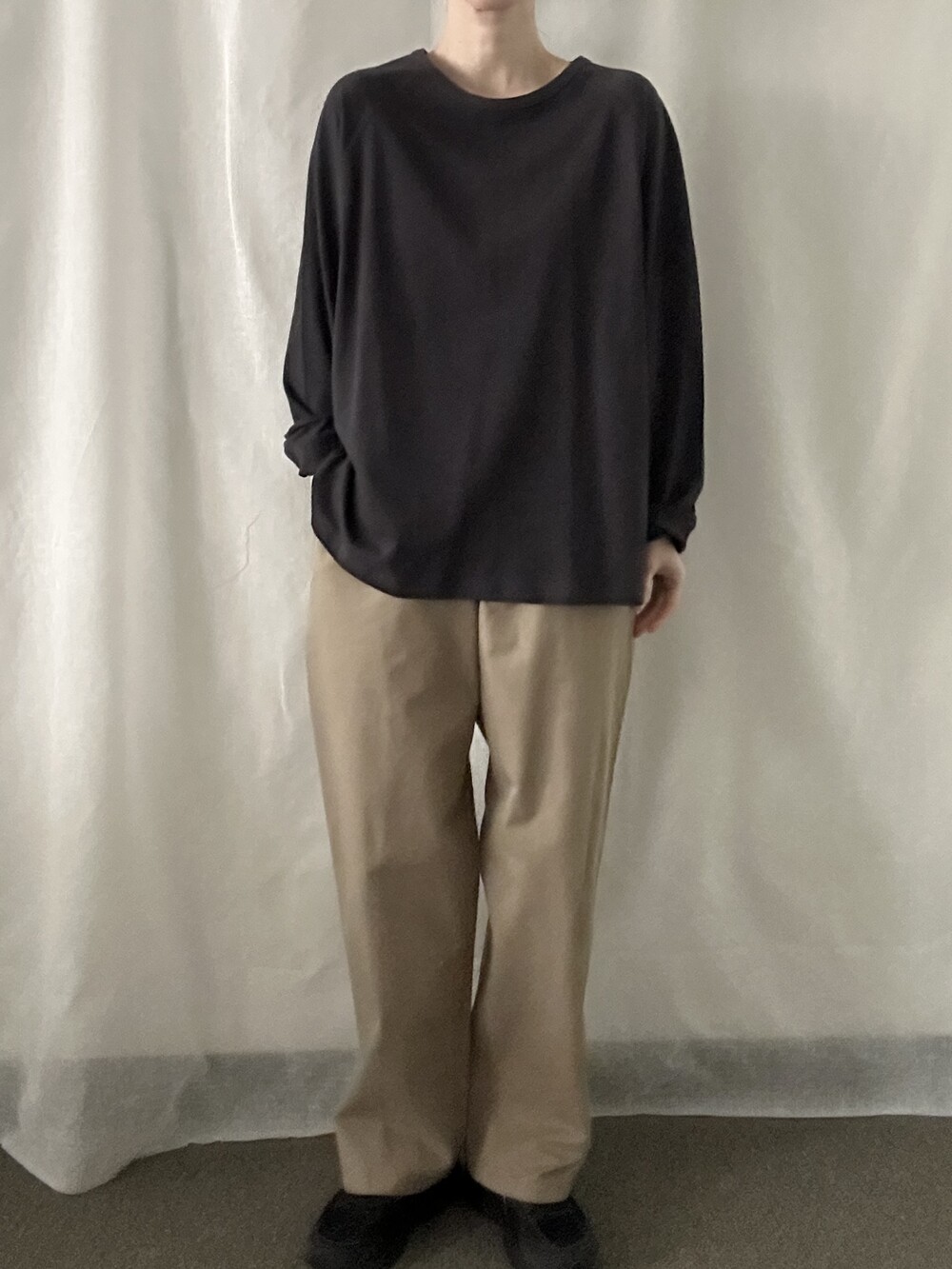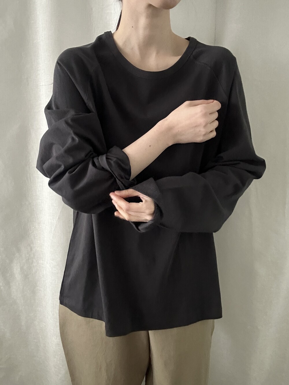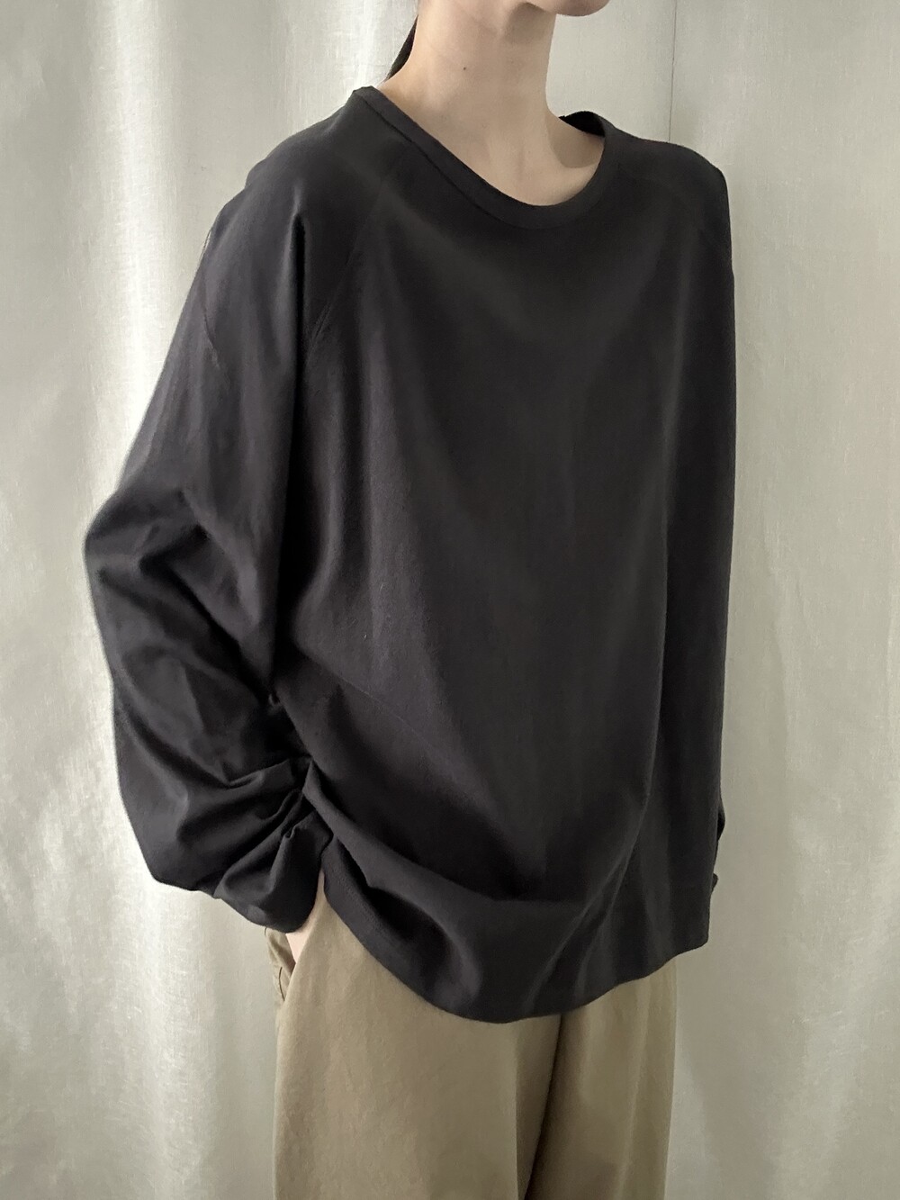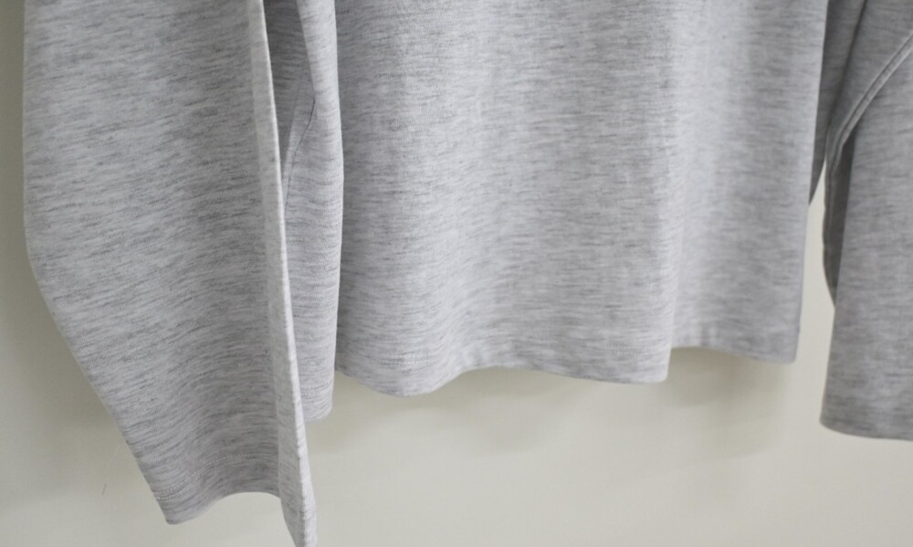 래글런 어깨 패턴으로 넥 라인은 답답하지 않고 길이감도 긴 편입니다.