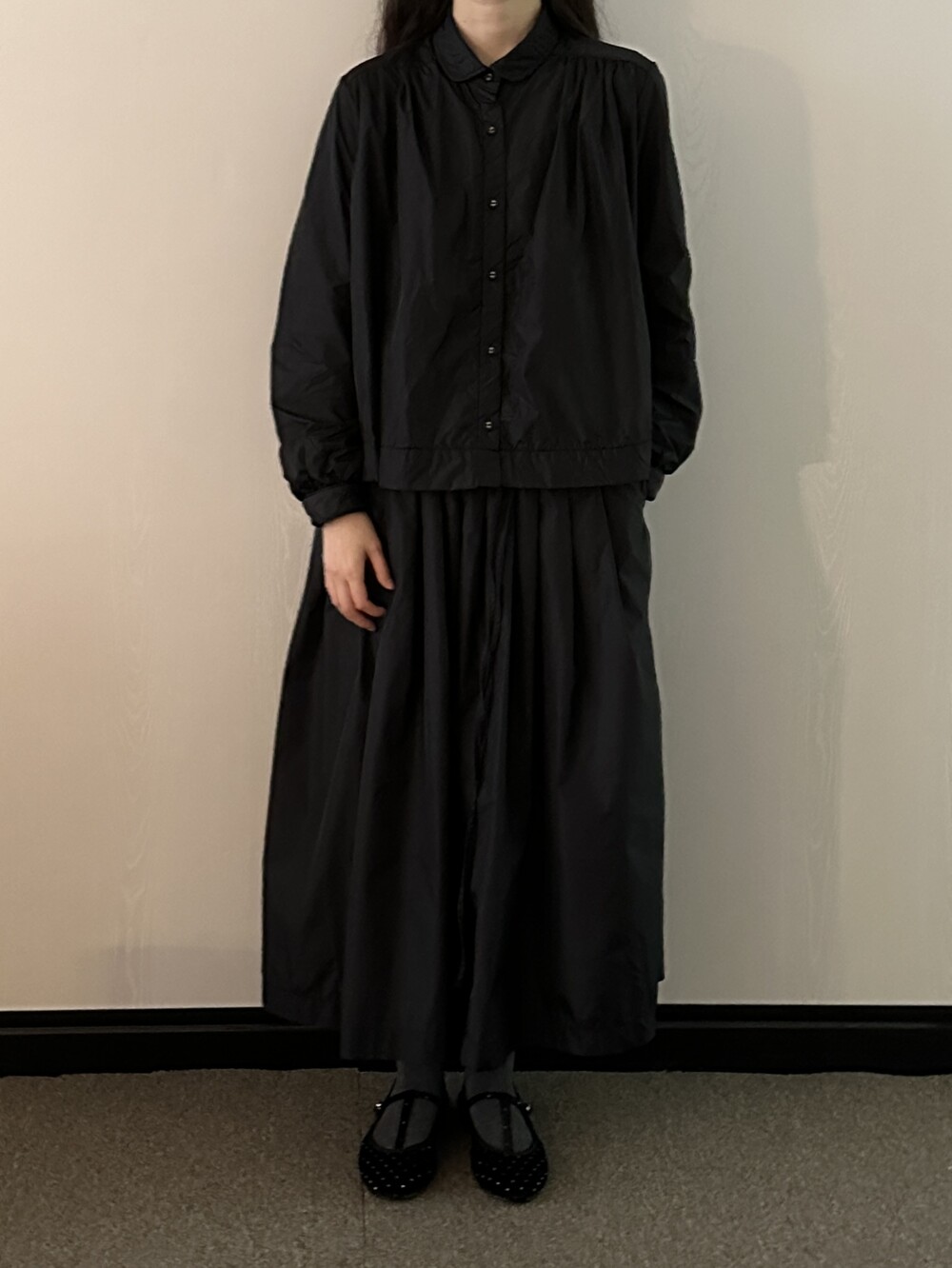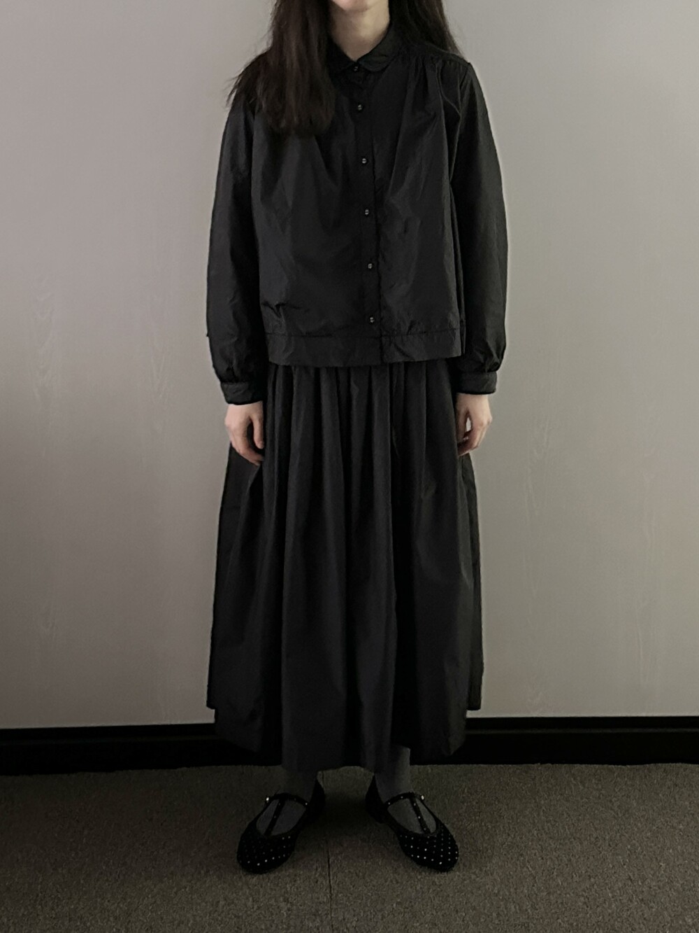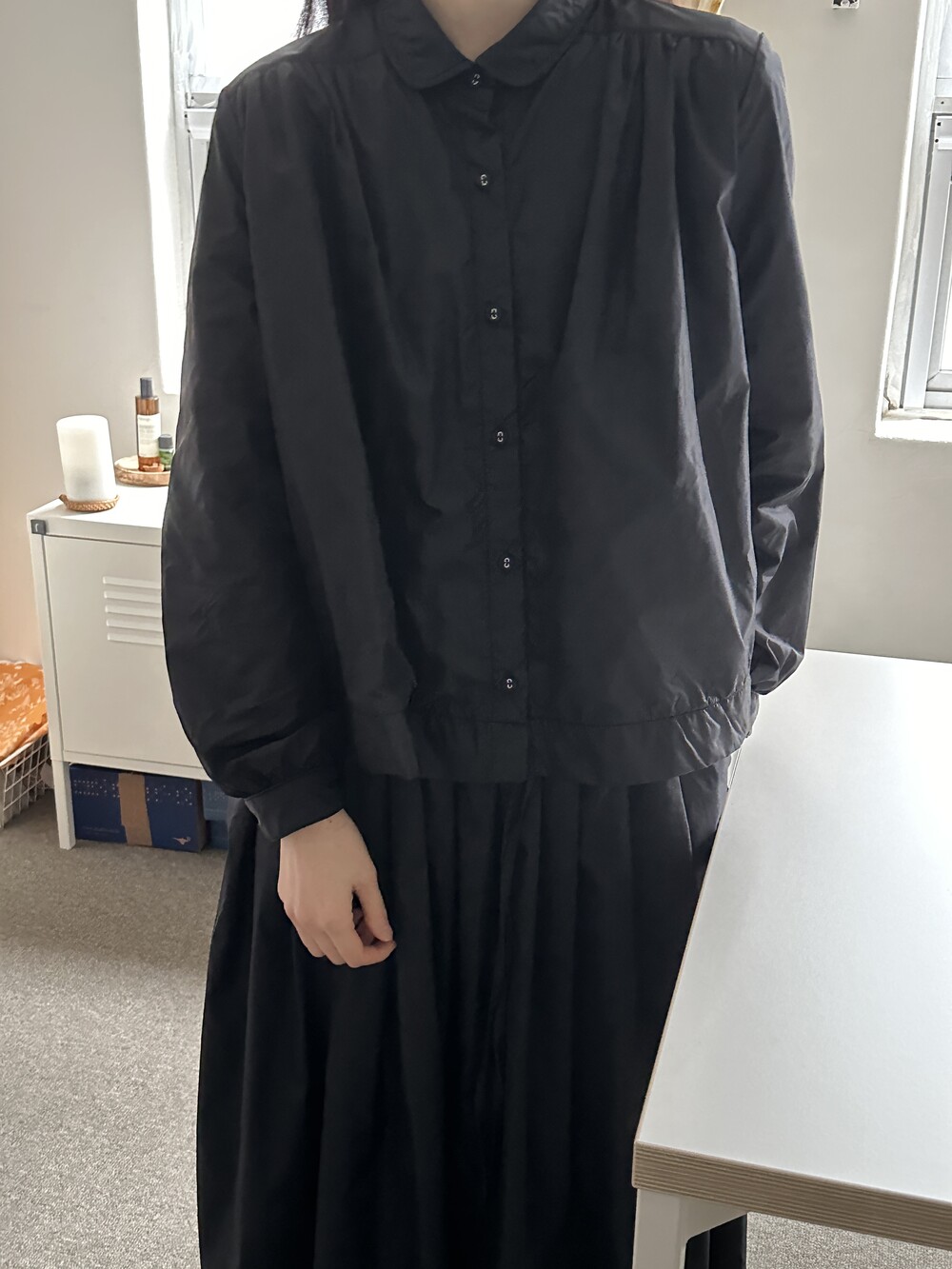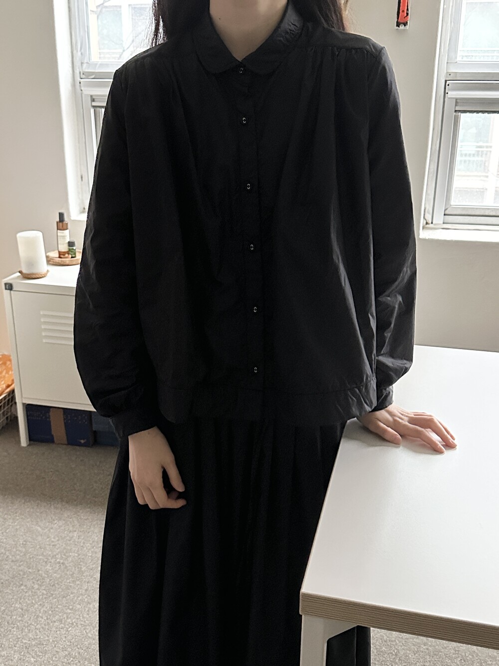 블라우스는 단정하고 귀여운 둥근 카라에 어깨에 셔링이 들어가 단조로움 속에 포인트를 주었습니다.