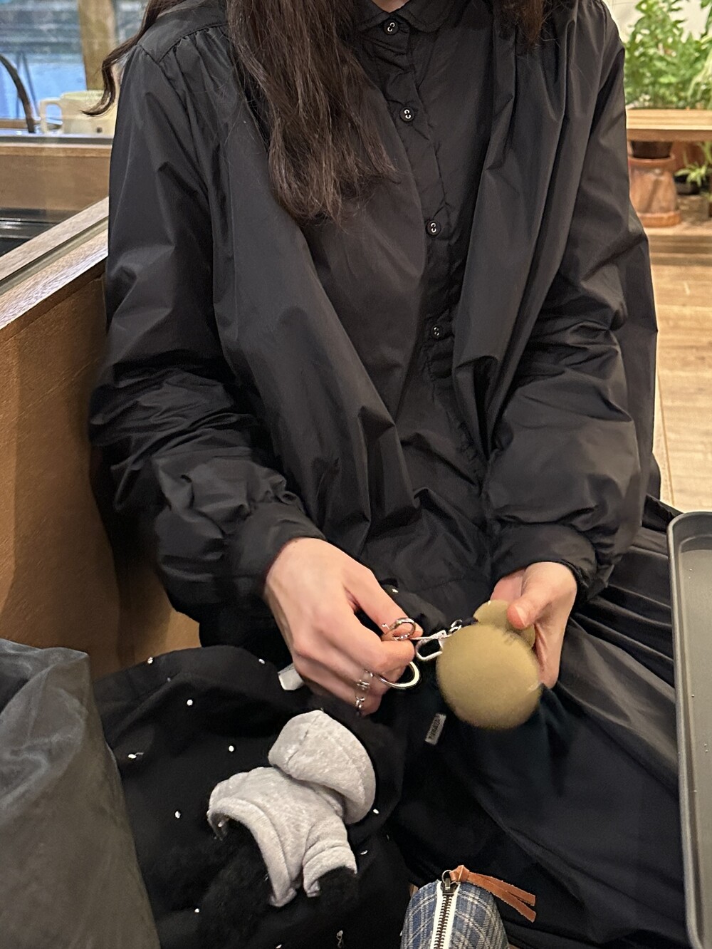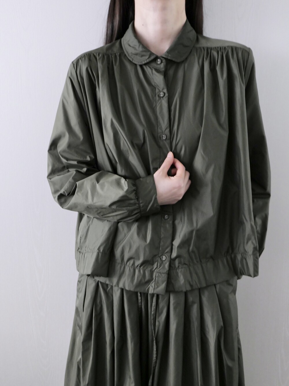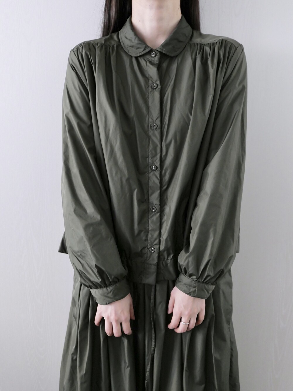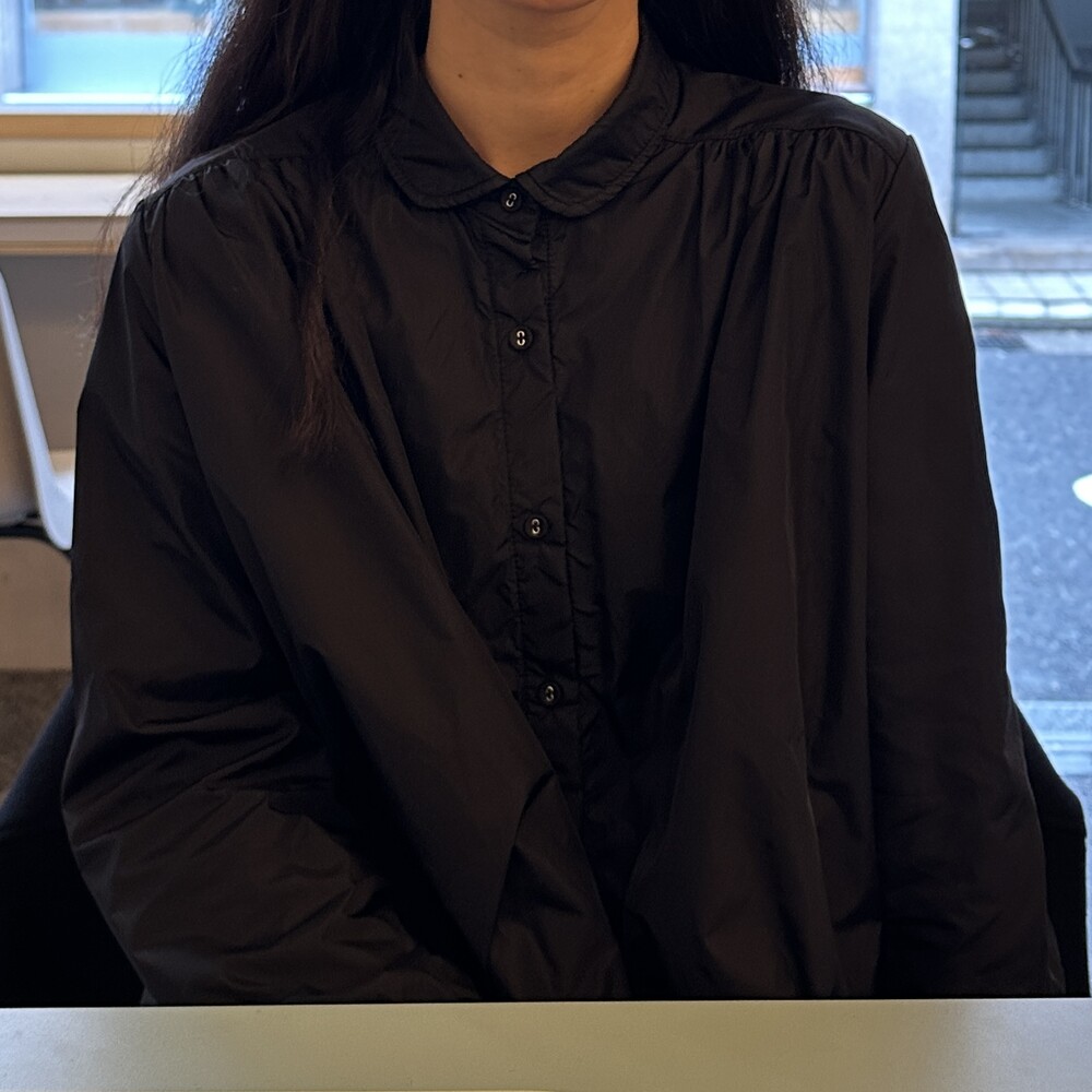 블라우스는 단정하고 귀여운 둥근 카라에 어깨에 셔링이 들어가 단조로움 속에 포인트를 주었습니다.