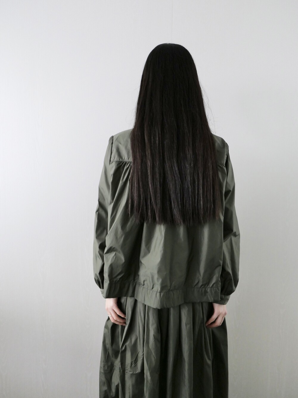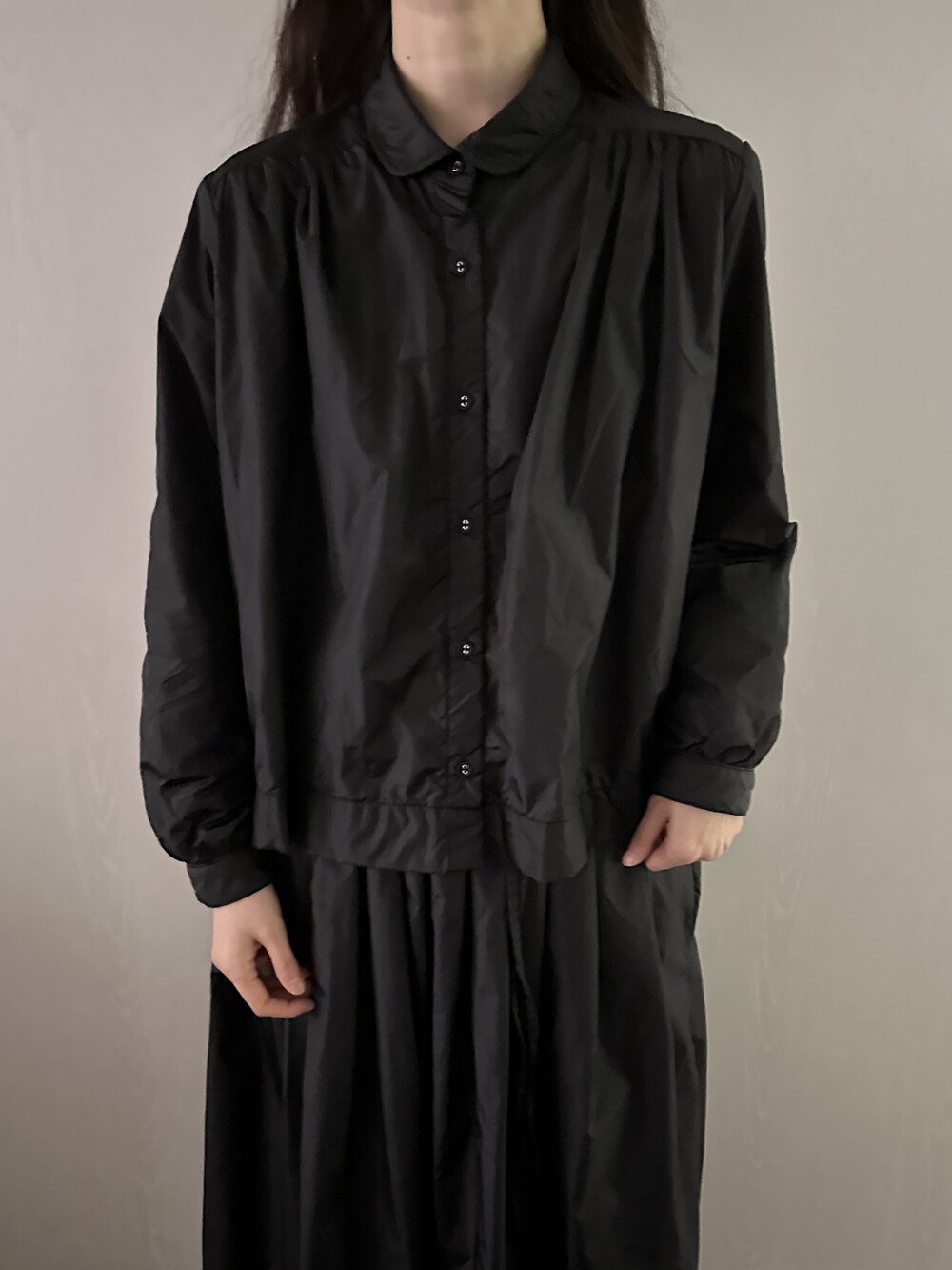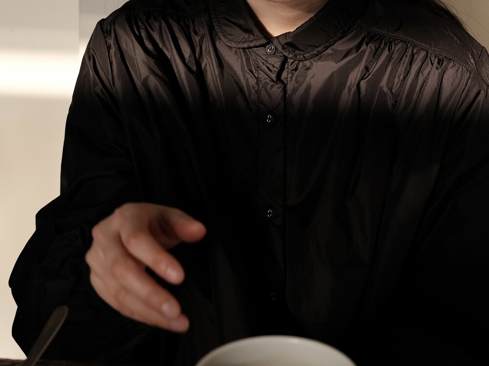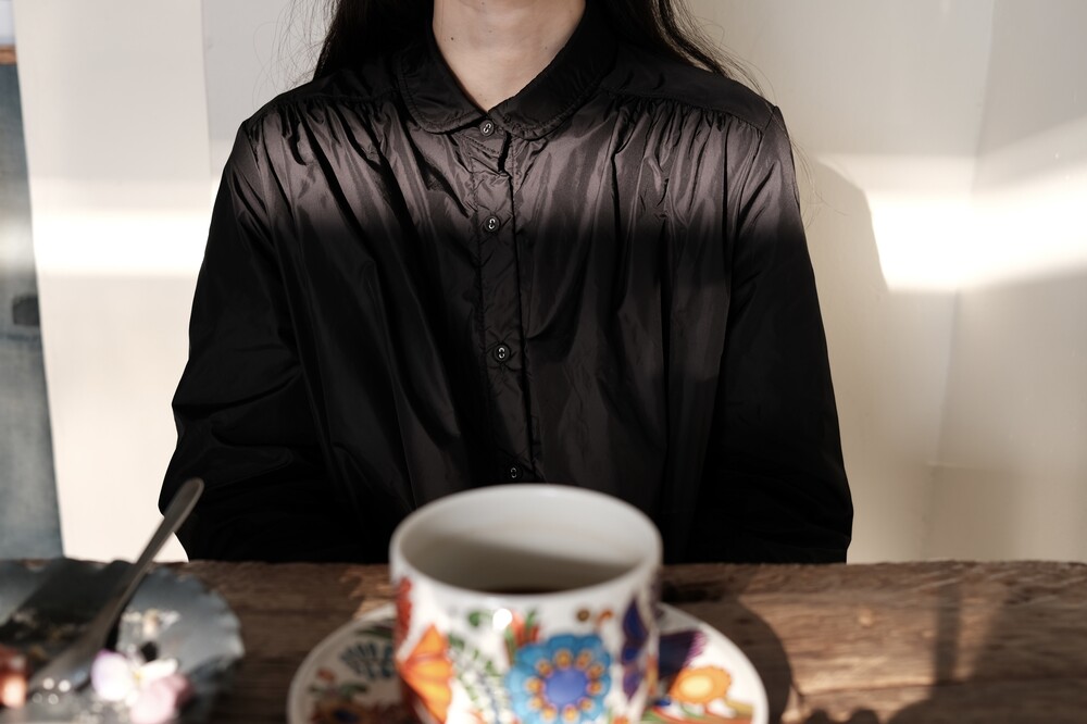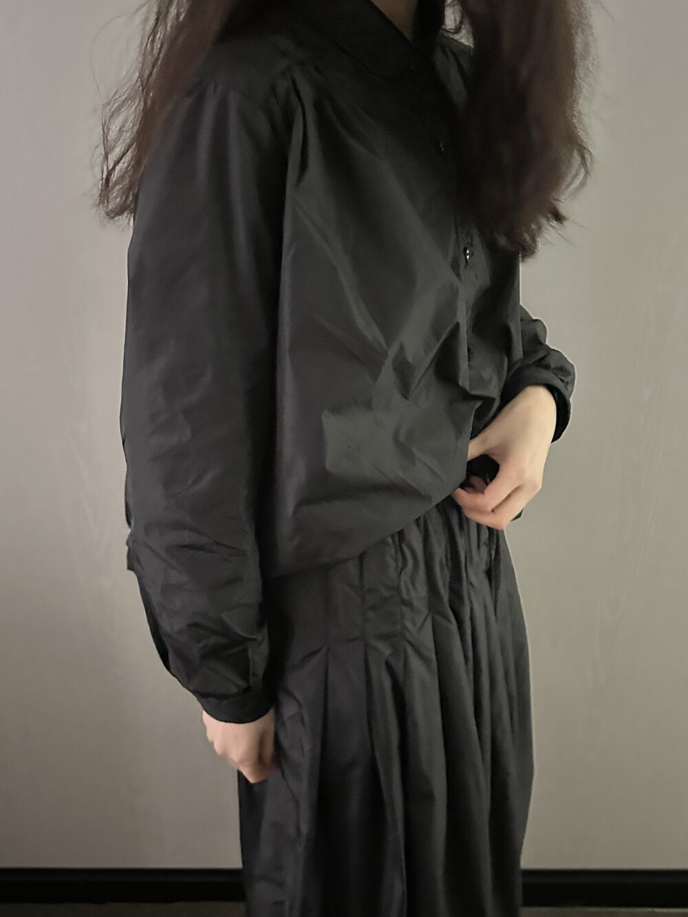 블라우스는 단정하고 귀여운 둥근 카라에 어깨에 셔링이 들어가 단조로움 속에 포인트를 주었습니다.