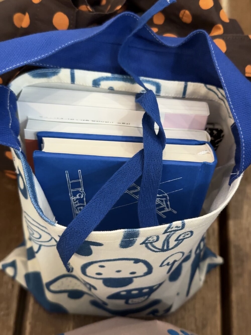 책을 담아 가지고 다니기 좋은 작은 사이즈의 북백입니다.