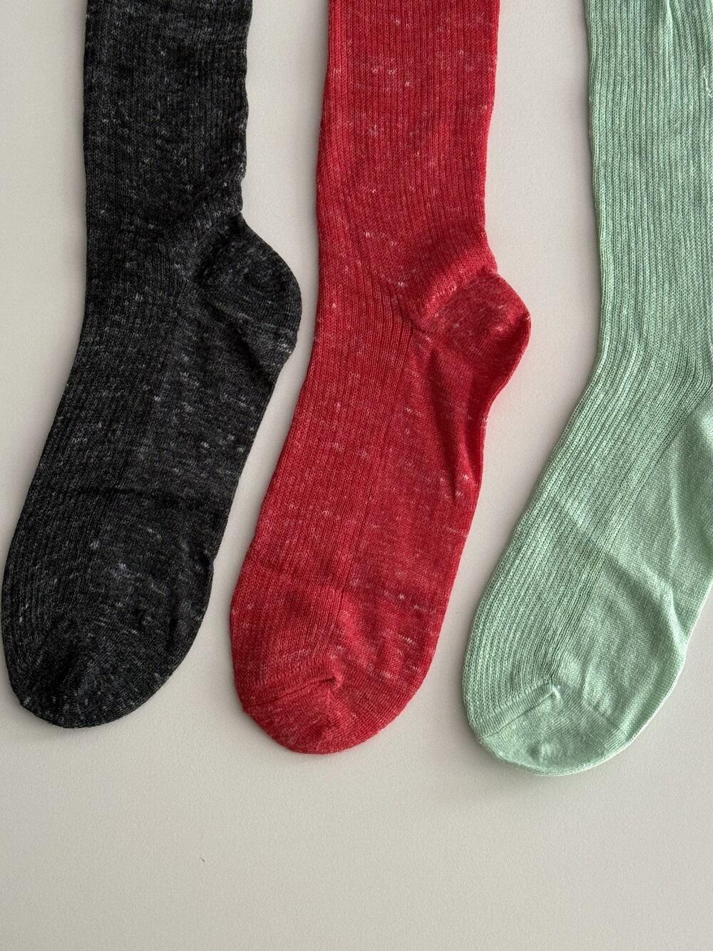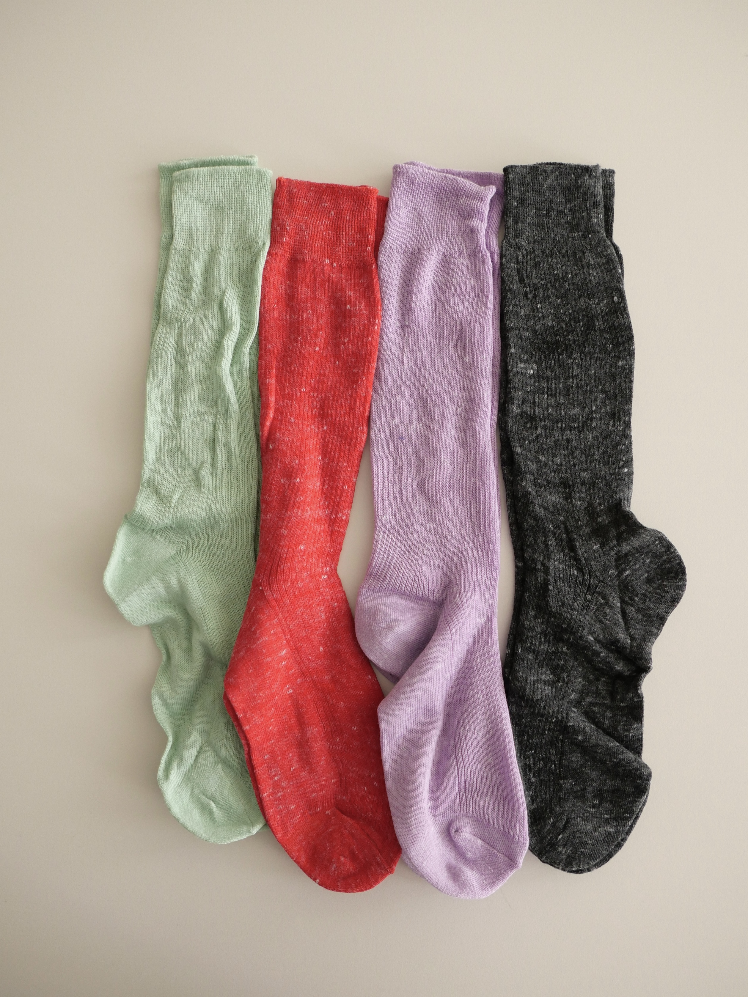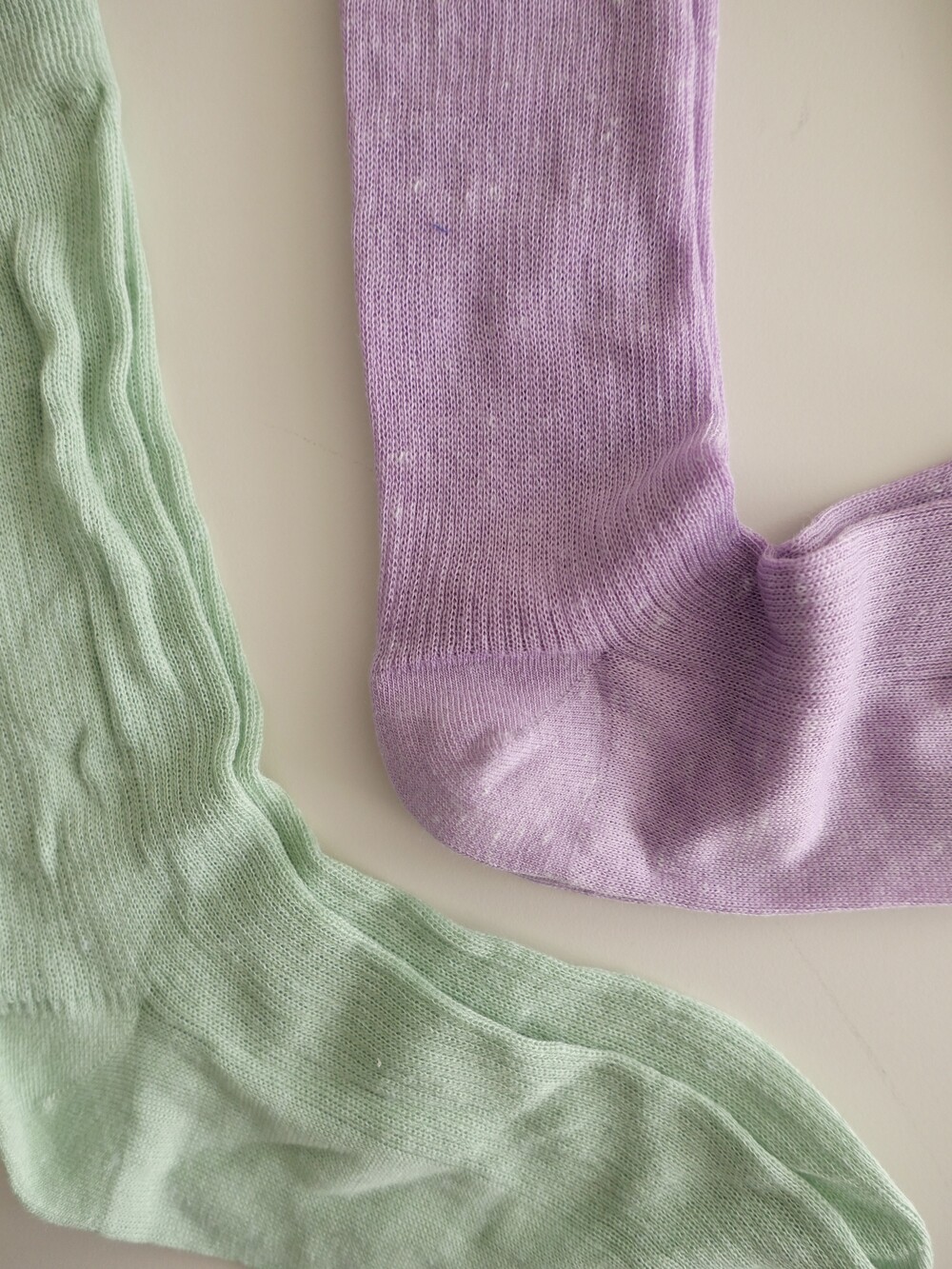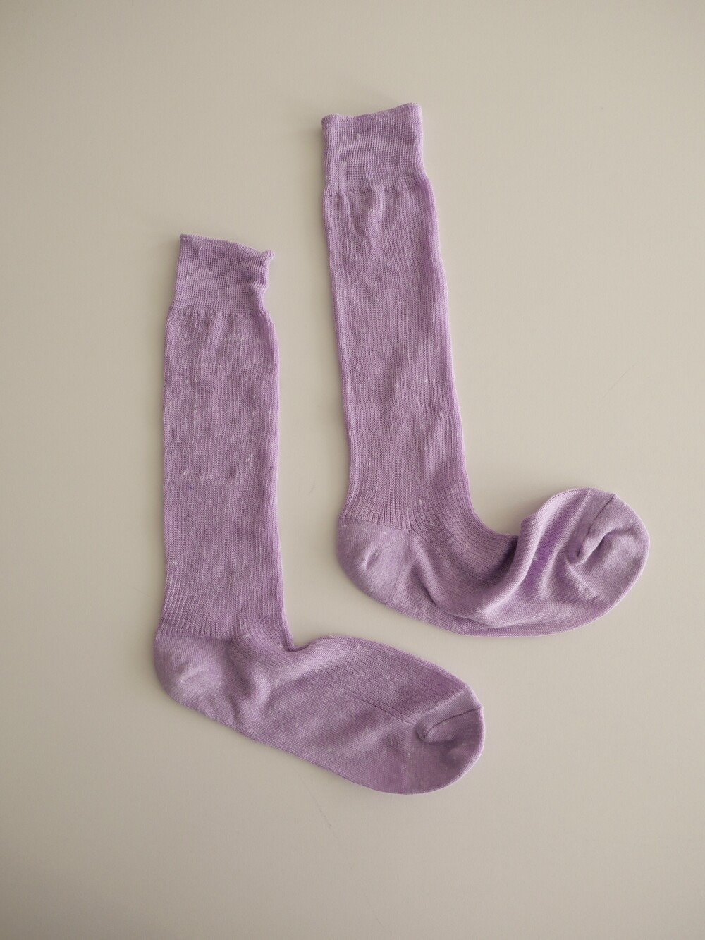 화이트 칩이 콕콕 박힌 빈티지한 색감의 목길이가 긴 양말입니다.
