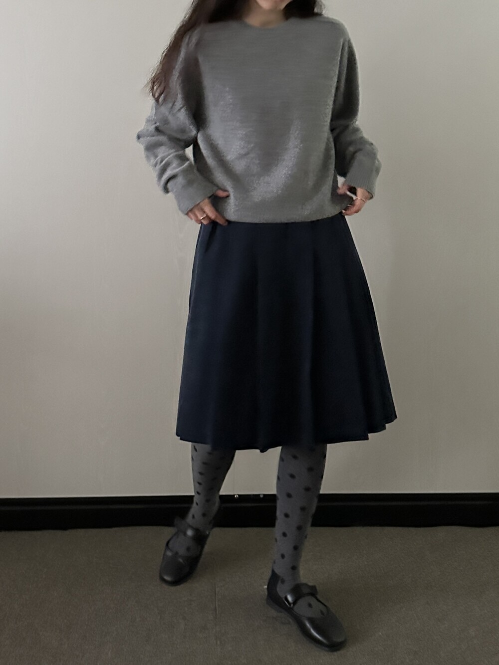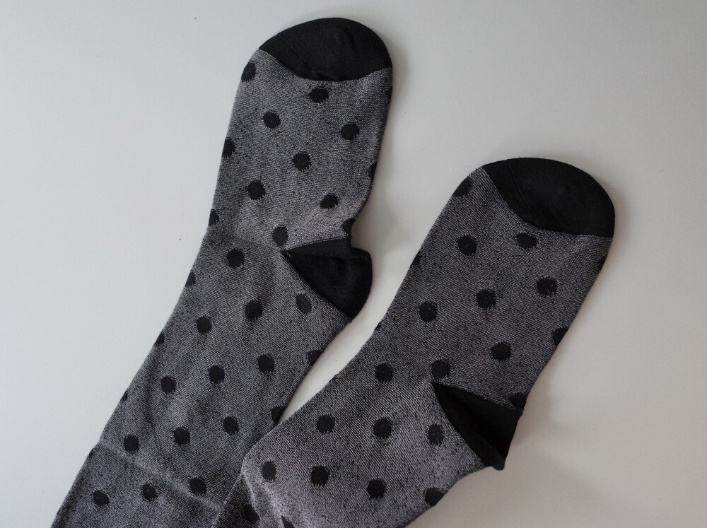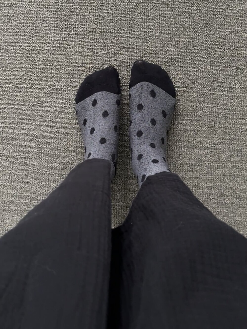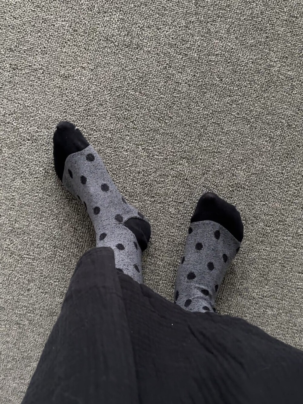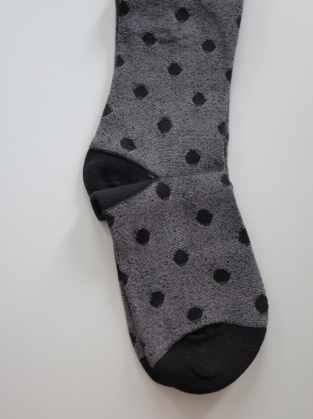 신축성이 좋고 터치감이 부드러워 자극 없이 착용 가능합니다. 차콜 컬러에 블랙 도트로 배색이 과하지 않아 매치하기 좋습니다.